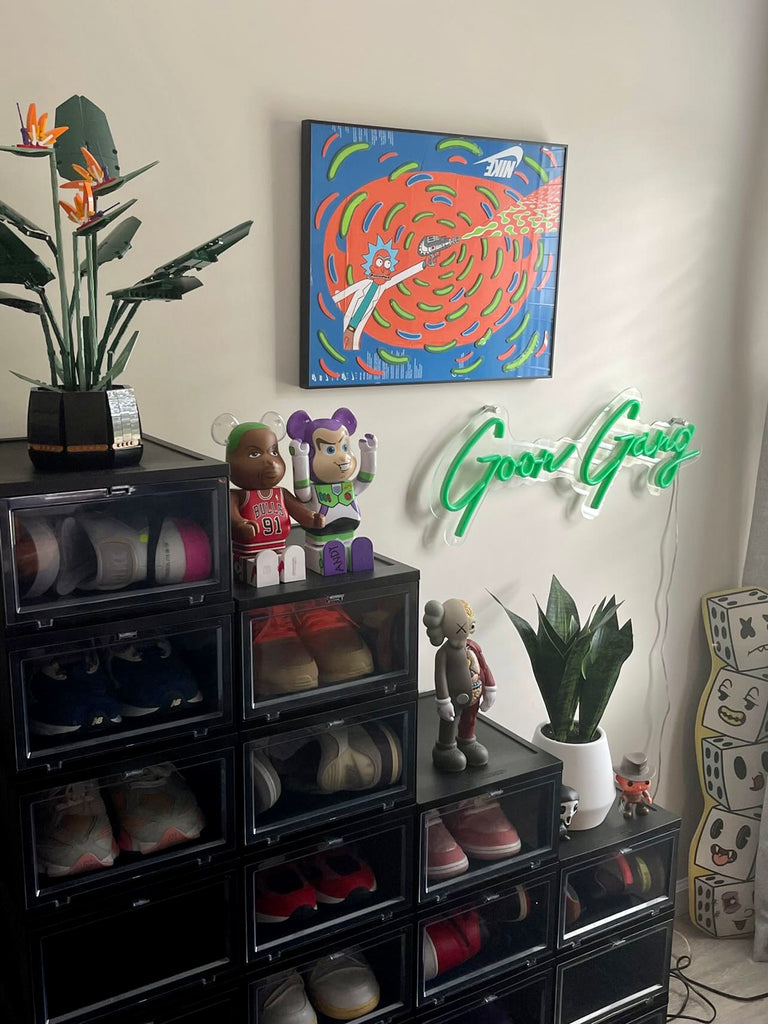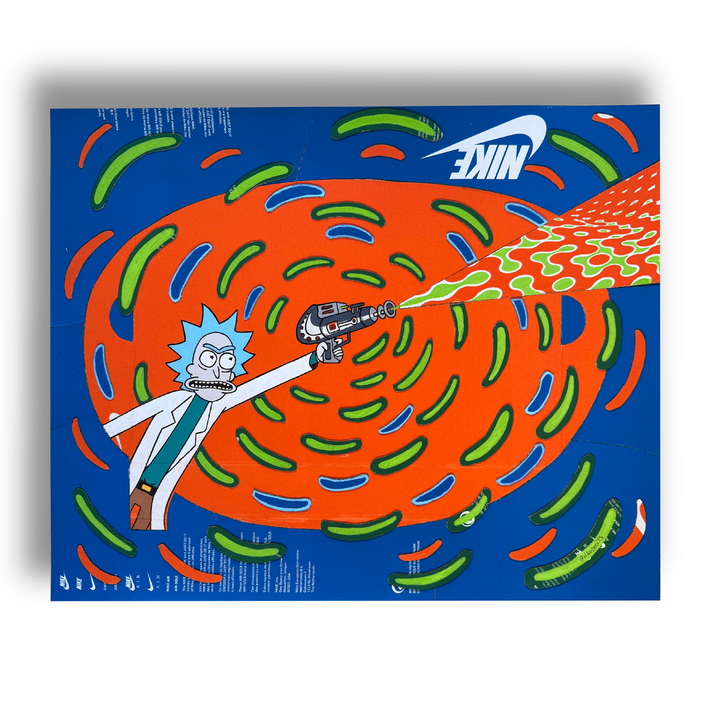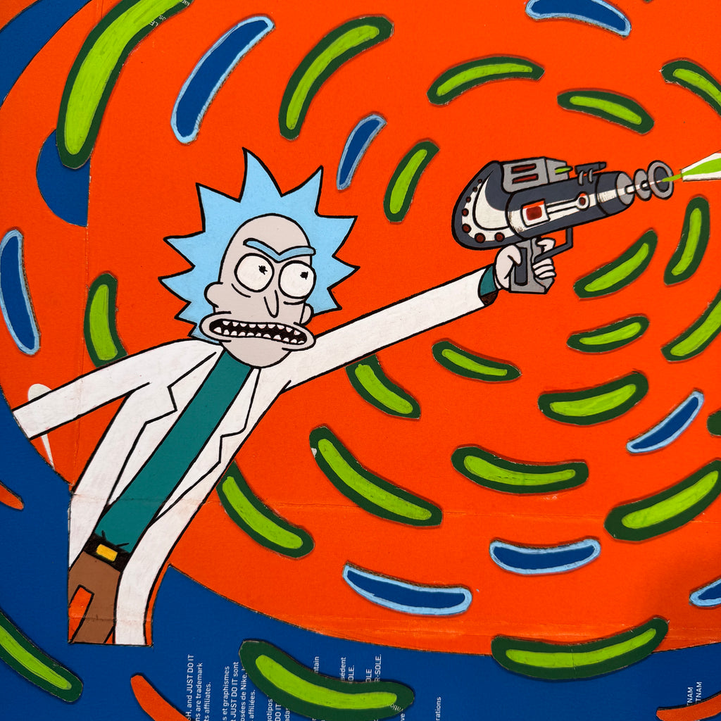 Paying homage to Rick and Morty, this piece has Rick front and center while using a ray gun which is created from the box's logo. A bright and vibrant piece which great contrast is sure to make this one pop off the wall. Available in replica size, 16x20" (limited to 50) and 8x10"
