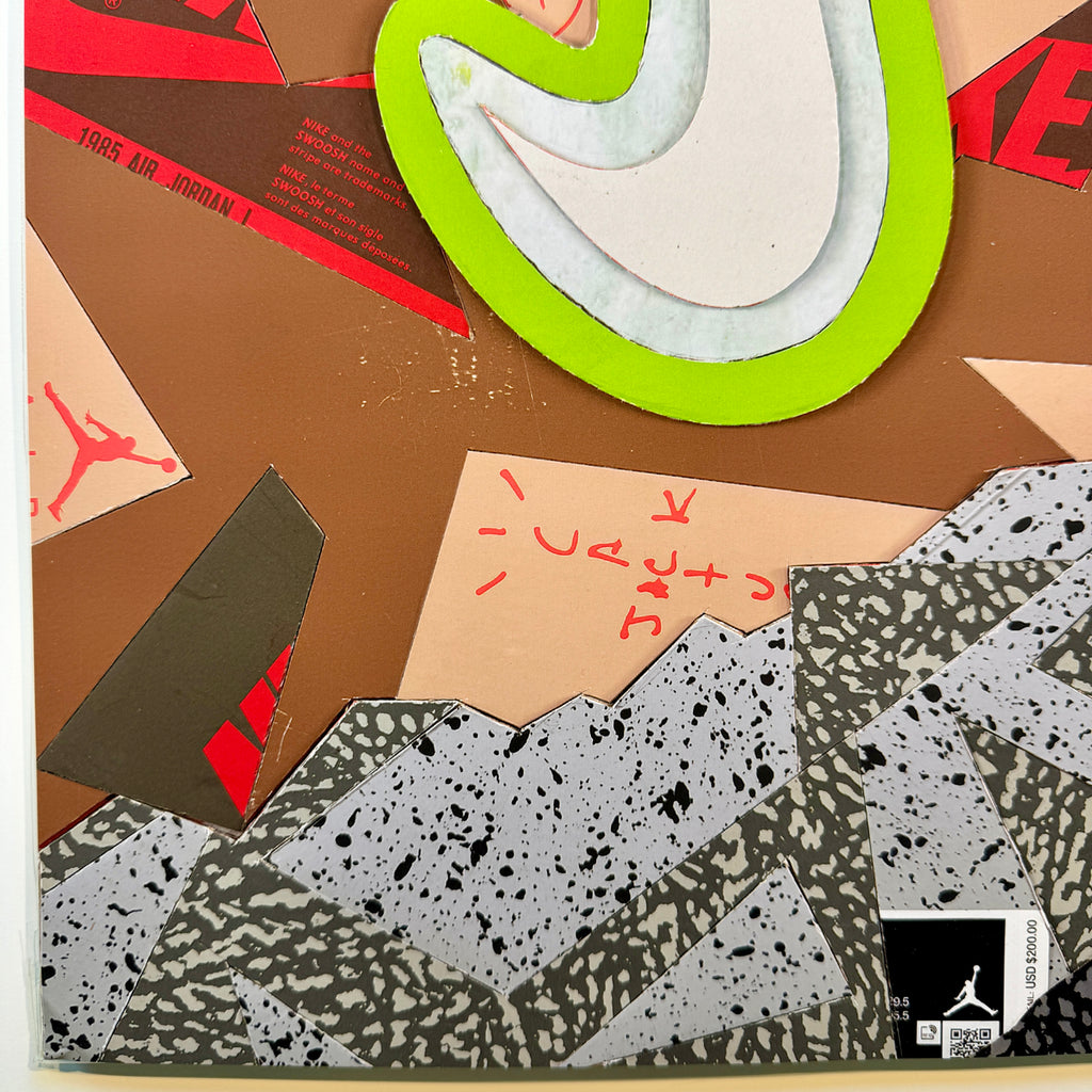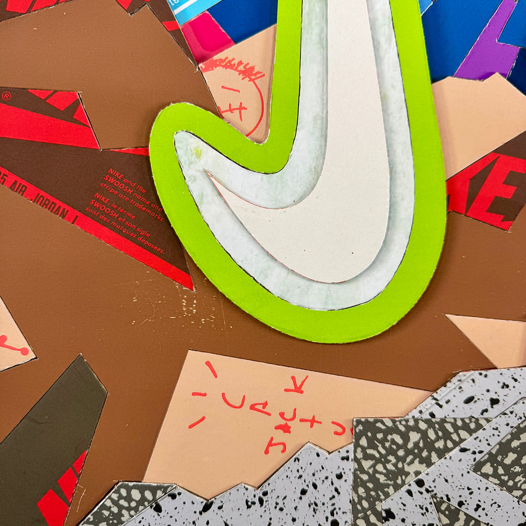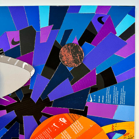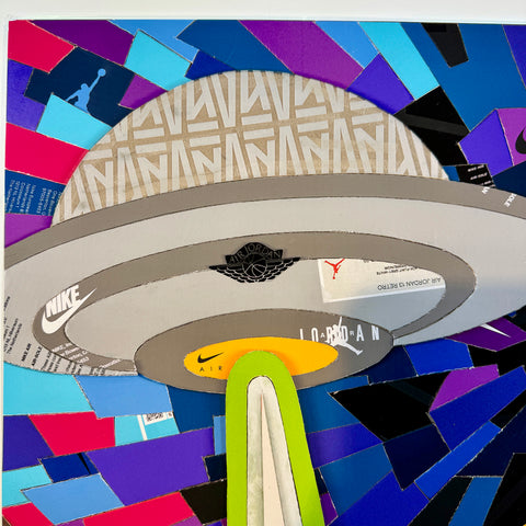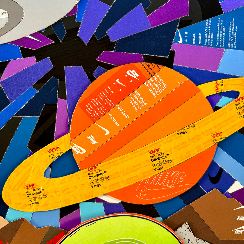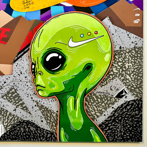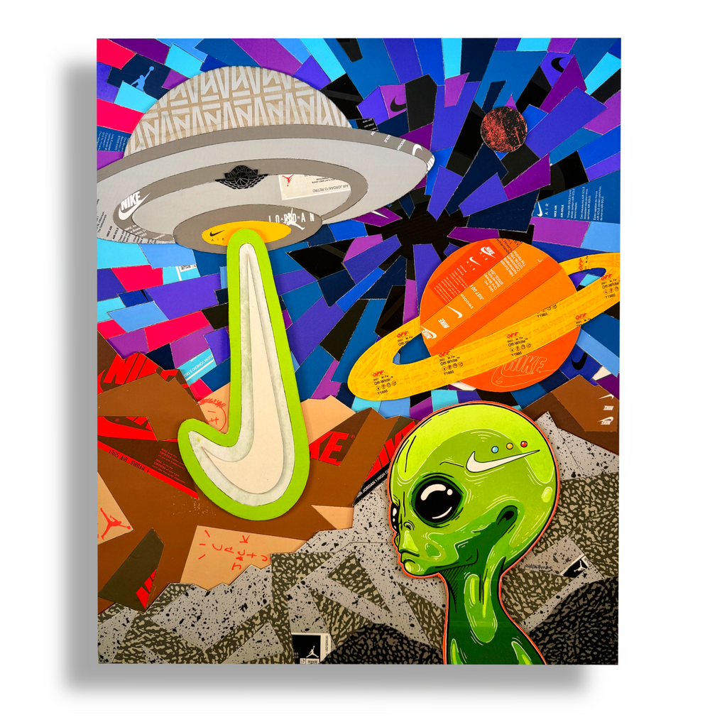 Off-White tissue paper planetary rings, Cactus Jack/ Cement Print embedded terrain, A-Ma-Maniere UFO glass and a black hole background all surround an Alien overlooking his world