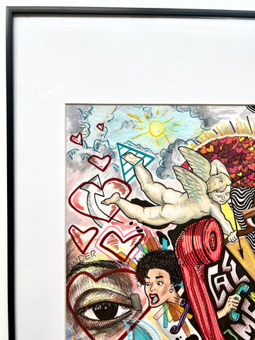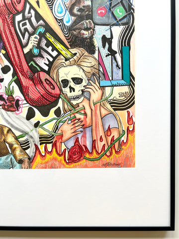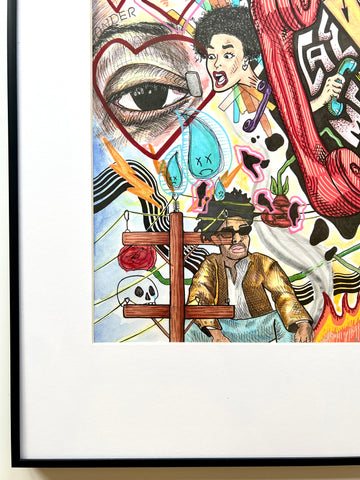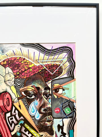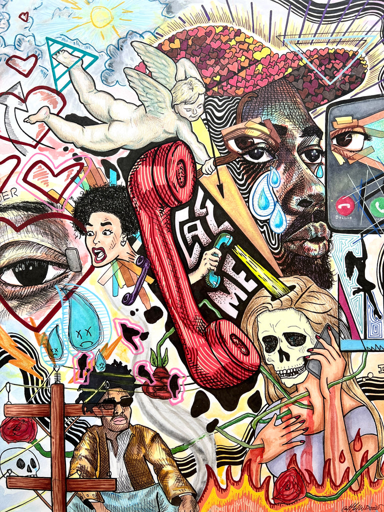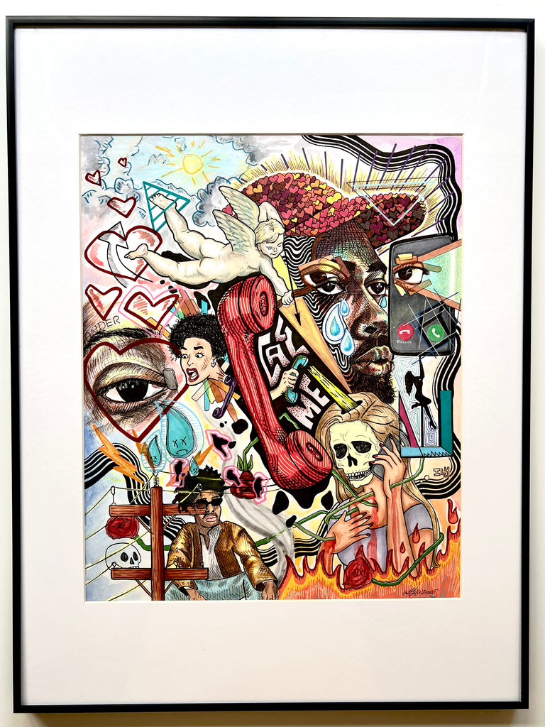 Colored pencil, ink, graphite, watercolor, acrylic, marker all come together in this abstract portrait featuring Brent Faiyaz. Rough references to some of his songs/ lyrics primarily focusing on his "16 missed calls" feature. Lots of technique and details packed into this one.