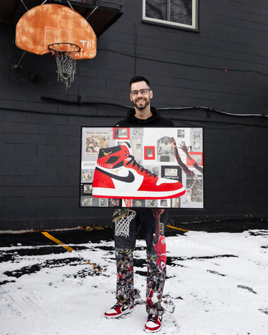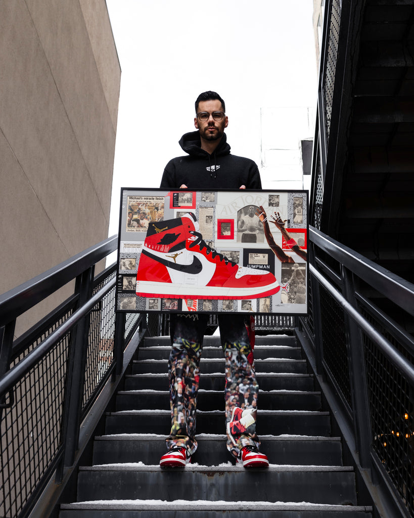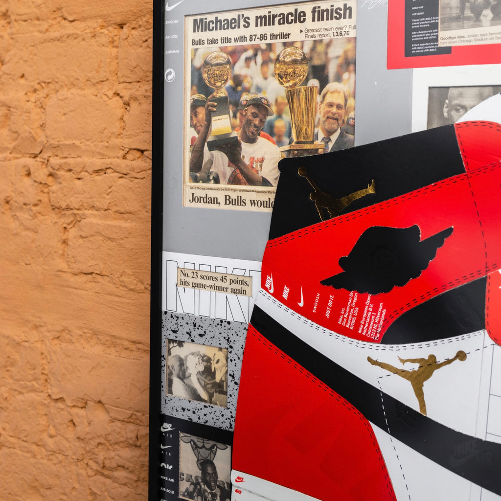 Details are scattered throughout in the shoebox made framing, featuring some iconic newspaper articles in the background surrounded by classic cement and elephant print boxes synonymous with the sneakers. The Union Jordan 4 box contributed the shooting hands of MJ. Classic images throughout Jordans playing career along with some of his acting and personal story are all present behind the 1985 Jordan sneaker made from upcycled boxes.