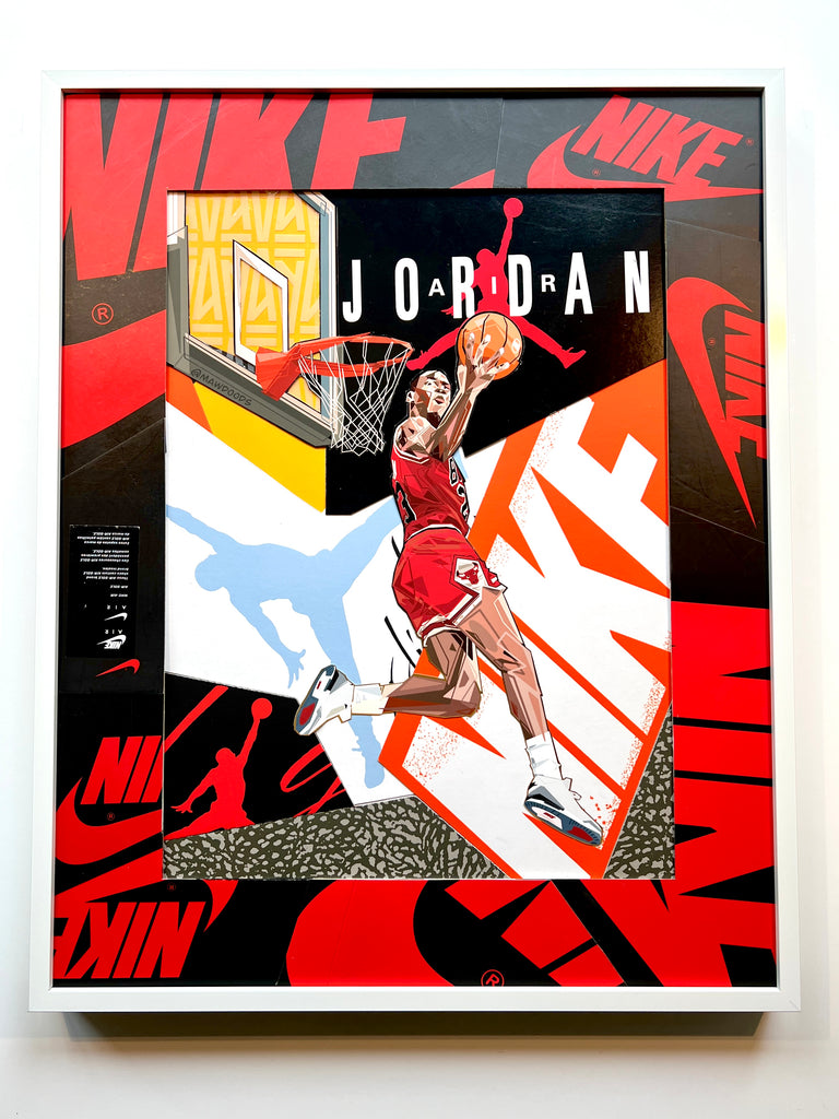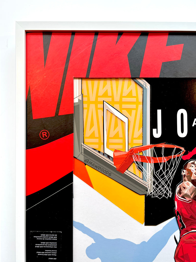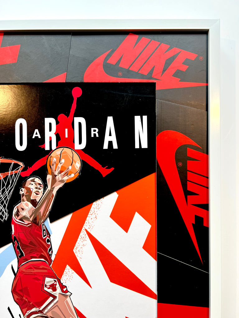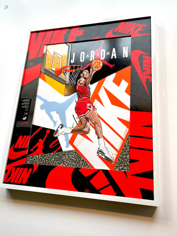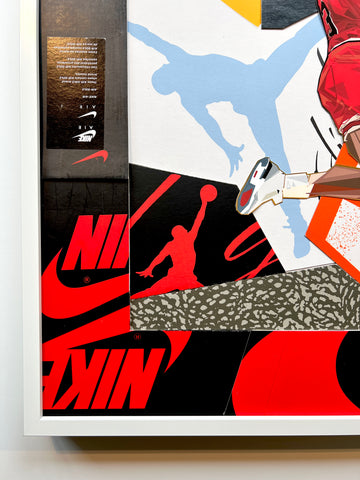 All ORIGINAL shoeboxes used, they are not printed, to create this work. Shoebox background, A Ma Maniere backboard panel, Jordan Retro 1 shoe box custom made matting. NO PRINTS MADE