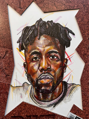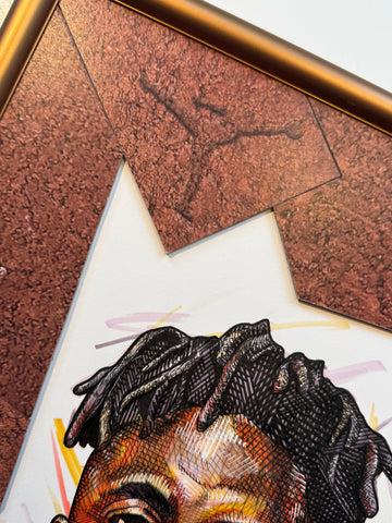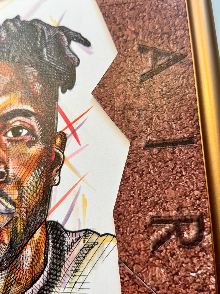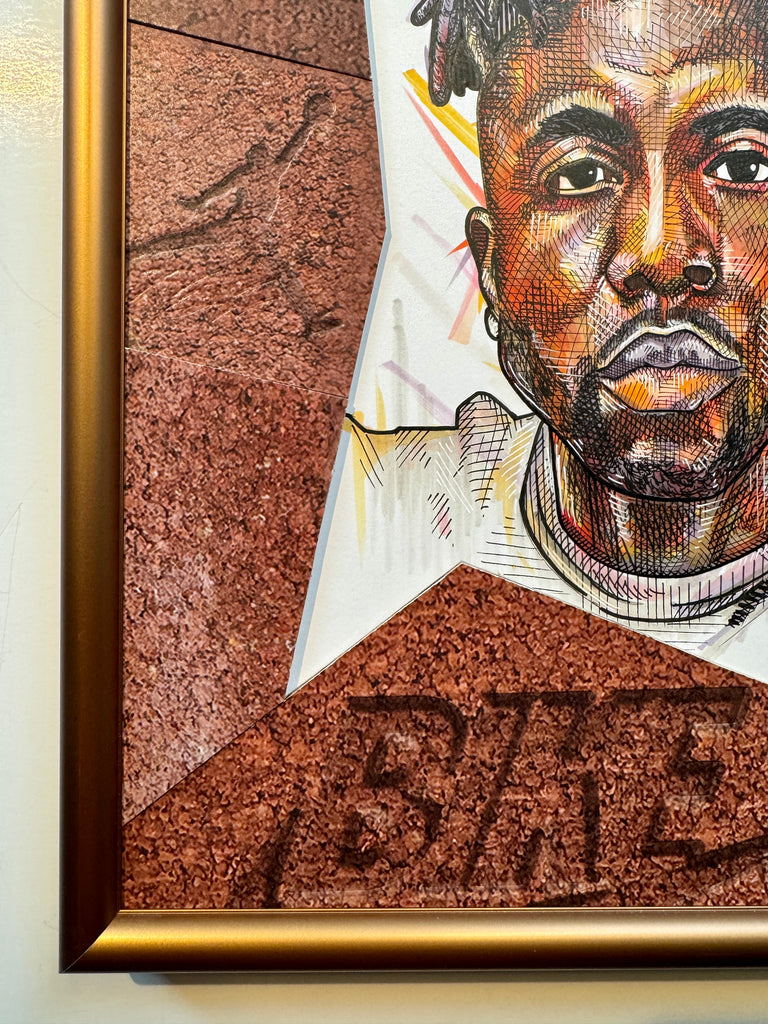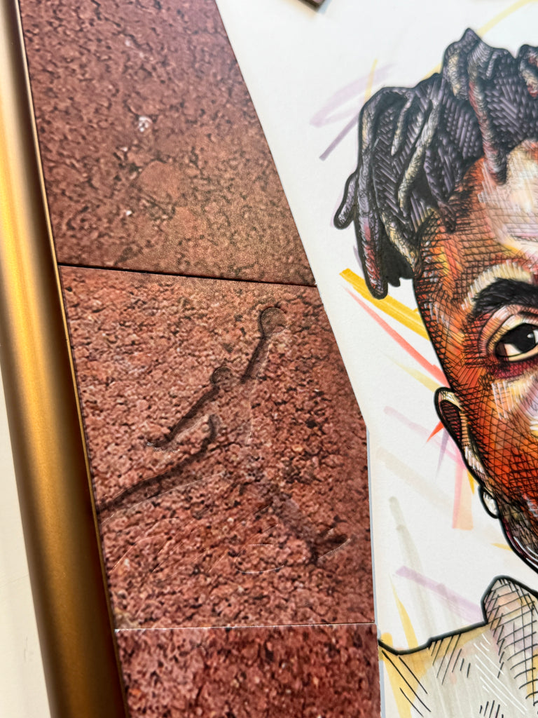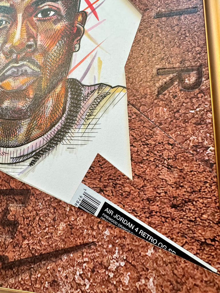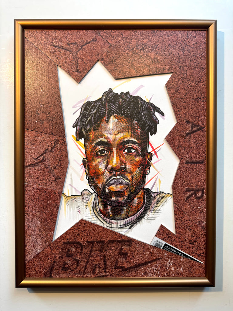 A "Kixed Media" original highlighting a hand drawn portrait of Nigel Sylvester, surrounded by an abstract matting built entirely out of the Jordan 4 Brick by Brick shoebox.  Frame in a custom bronze metal at 12x16"