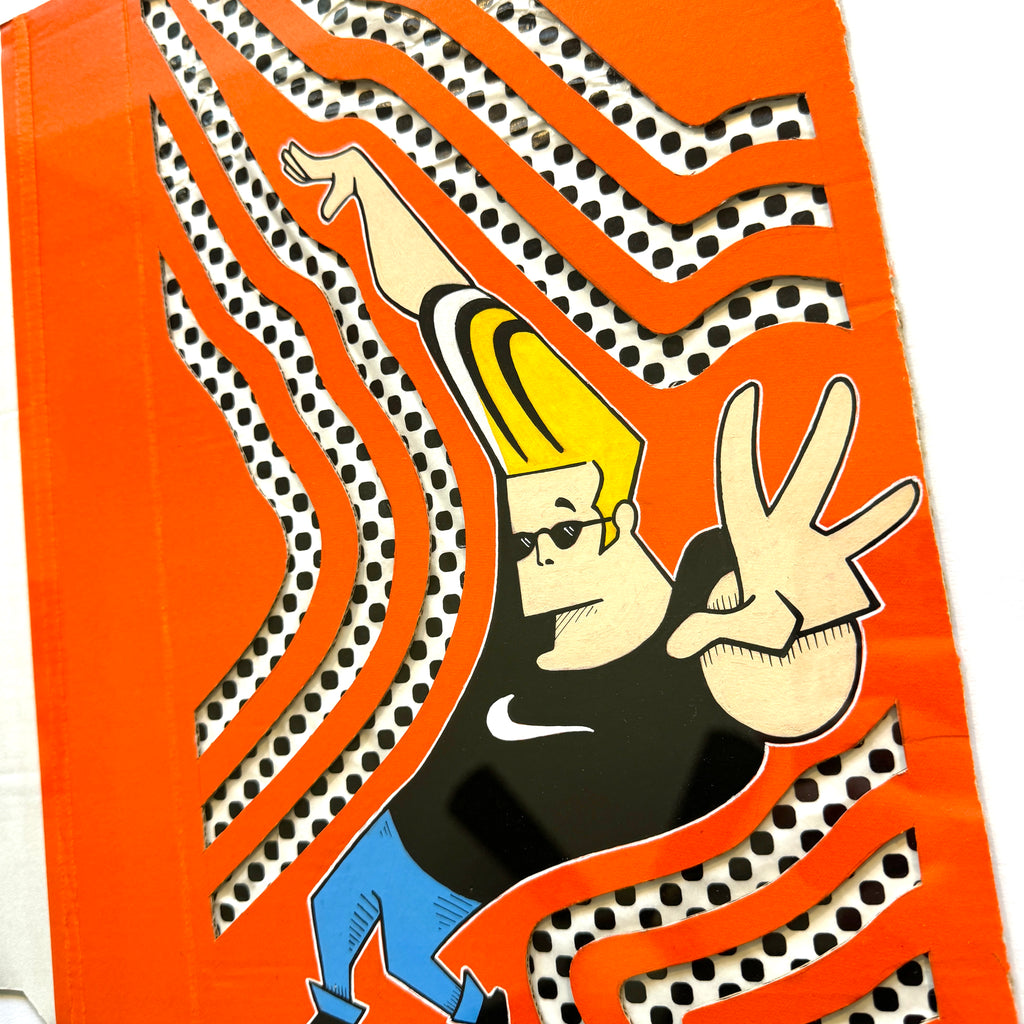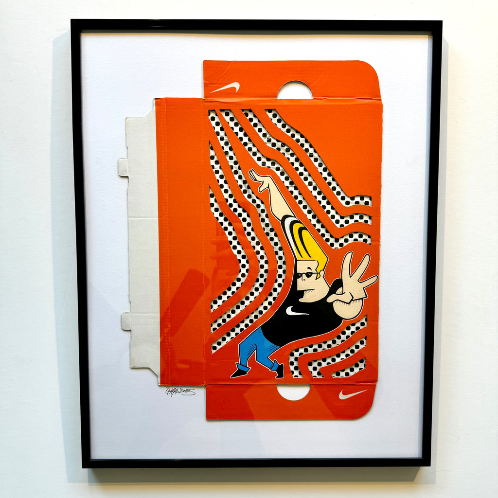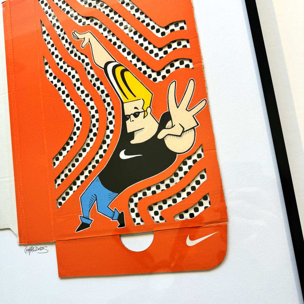 Original work featuring a throwback classic cartoon. Johnny's iconic hair takes shape within the centered box logo. Negative space removed from the shoebox is filled with Jordan XI tissue paper with that recognizable carbon fiber pattern that was featured on the sneaker's shank plate