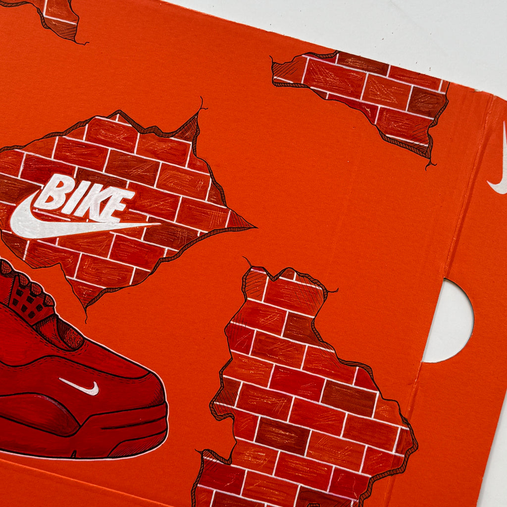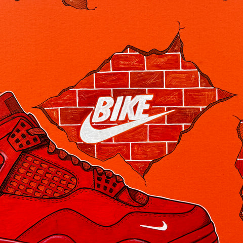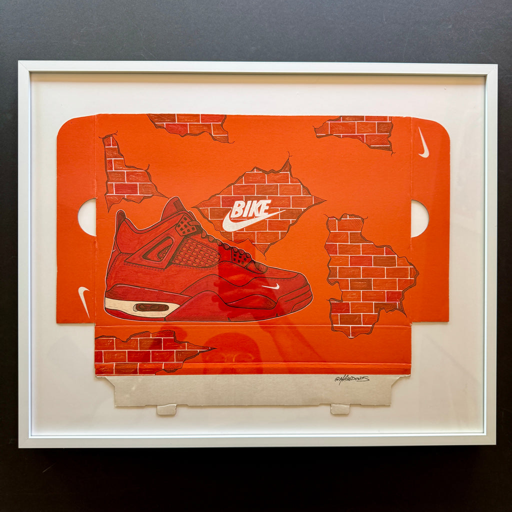 Paying homage to Nigel Sylvester's Jordan 4 collaboration. This piece is hand drawn on top of a classic orange shoebox. Integrating the logo and adding the "Bike" to it to match the heel tab of the sneaker. Hand drawn bricks exposed under the top later bring this one together.
