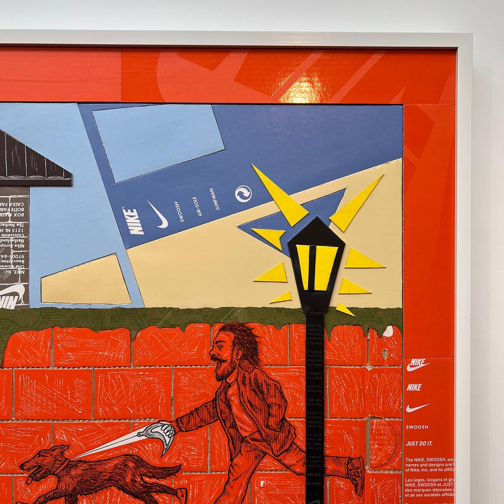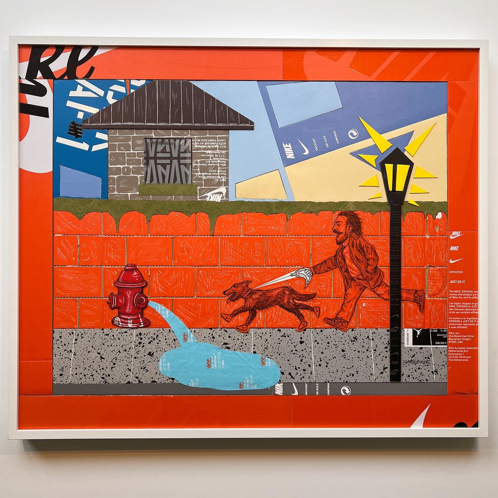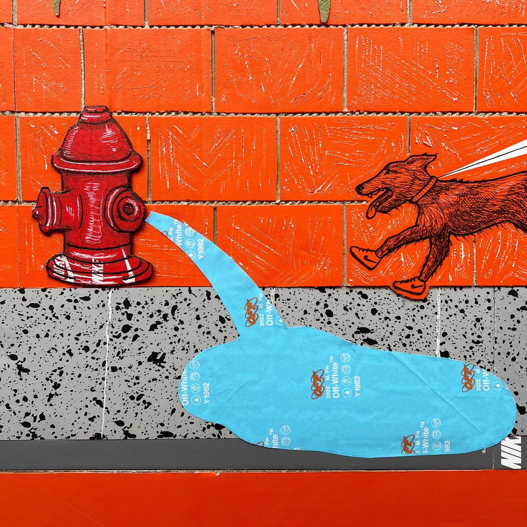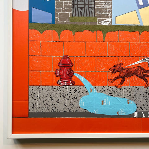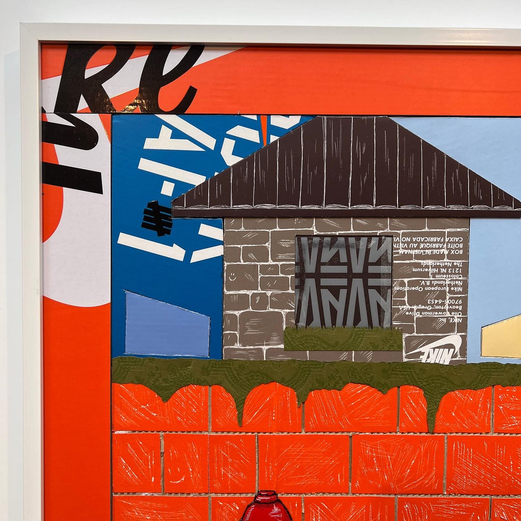 This original "Kixed Media" piece is almost completely made from shoe boxes with the exception of the Gucci Bag greenery draping over the brick wall. Key detailing includes hand carved brick in two styles, shingles, OFF WHITE tissue paper hydrant spray, and a vibrant flush matting.
