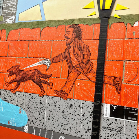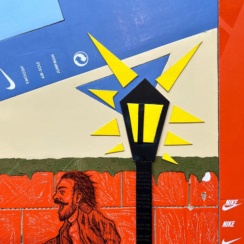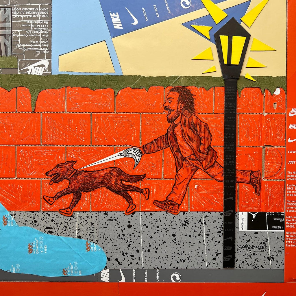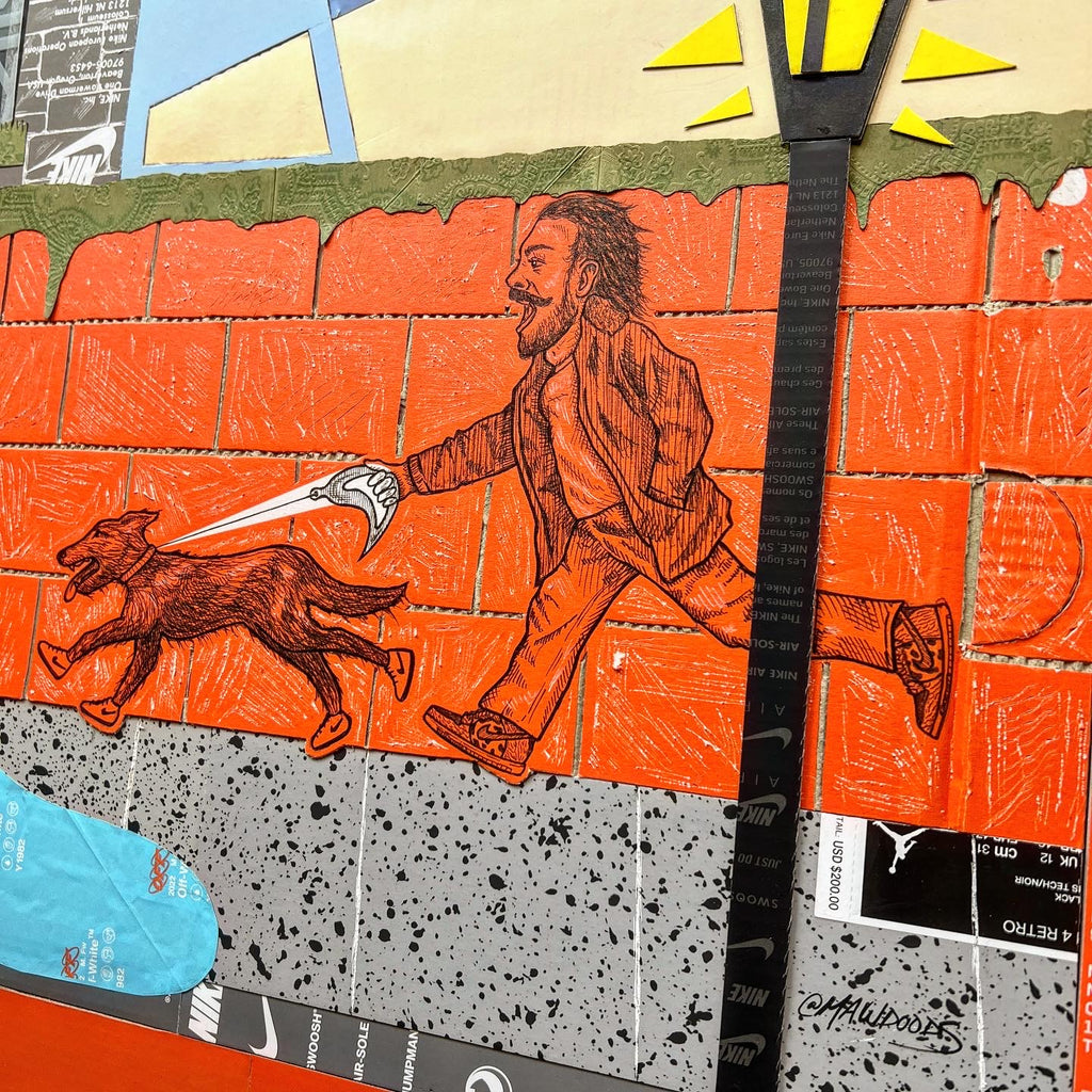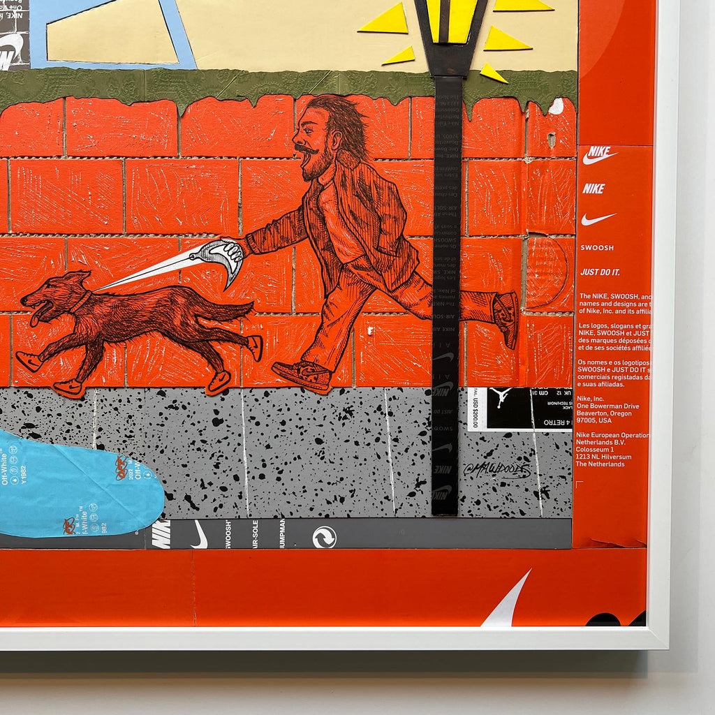 This original "Kixed Media" piece is almost completely made from shoe boxes with the exception of the Gucci Bag greenery draping over the brick wall. Key detailing includes hand carved brick in two styles, shingles, OFF WHITE tissue paper hydrant spray, and a vibrant flush matting.