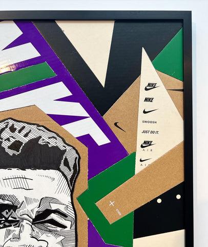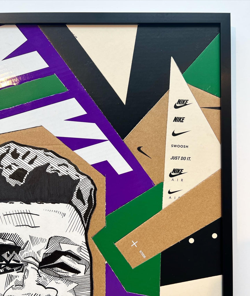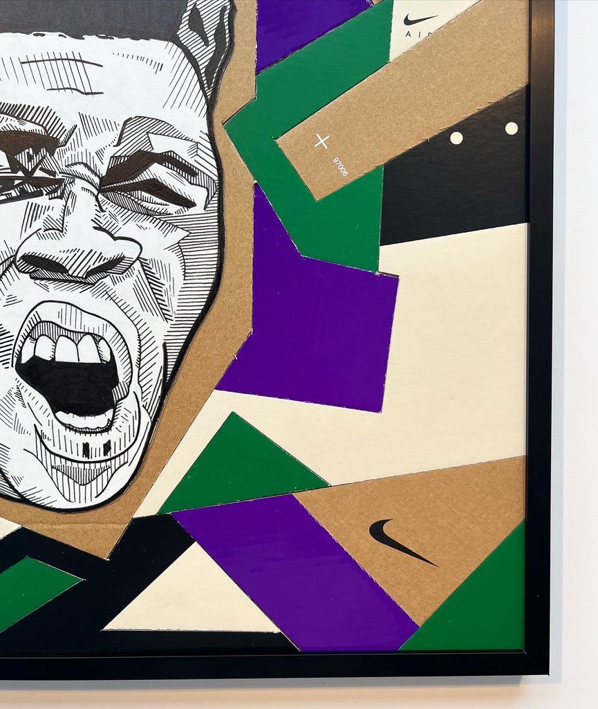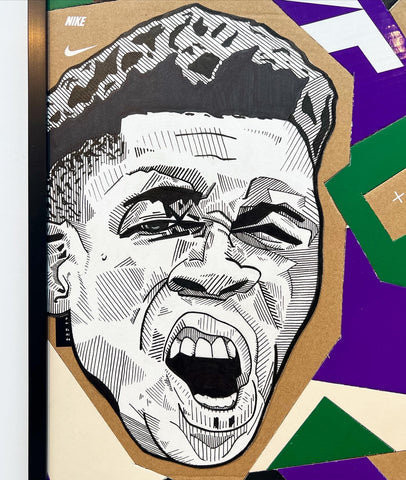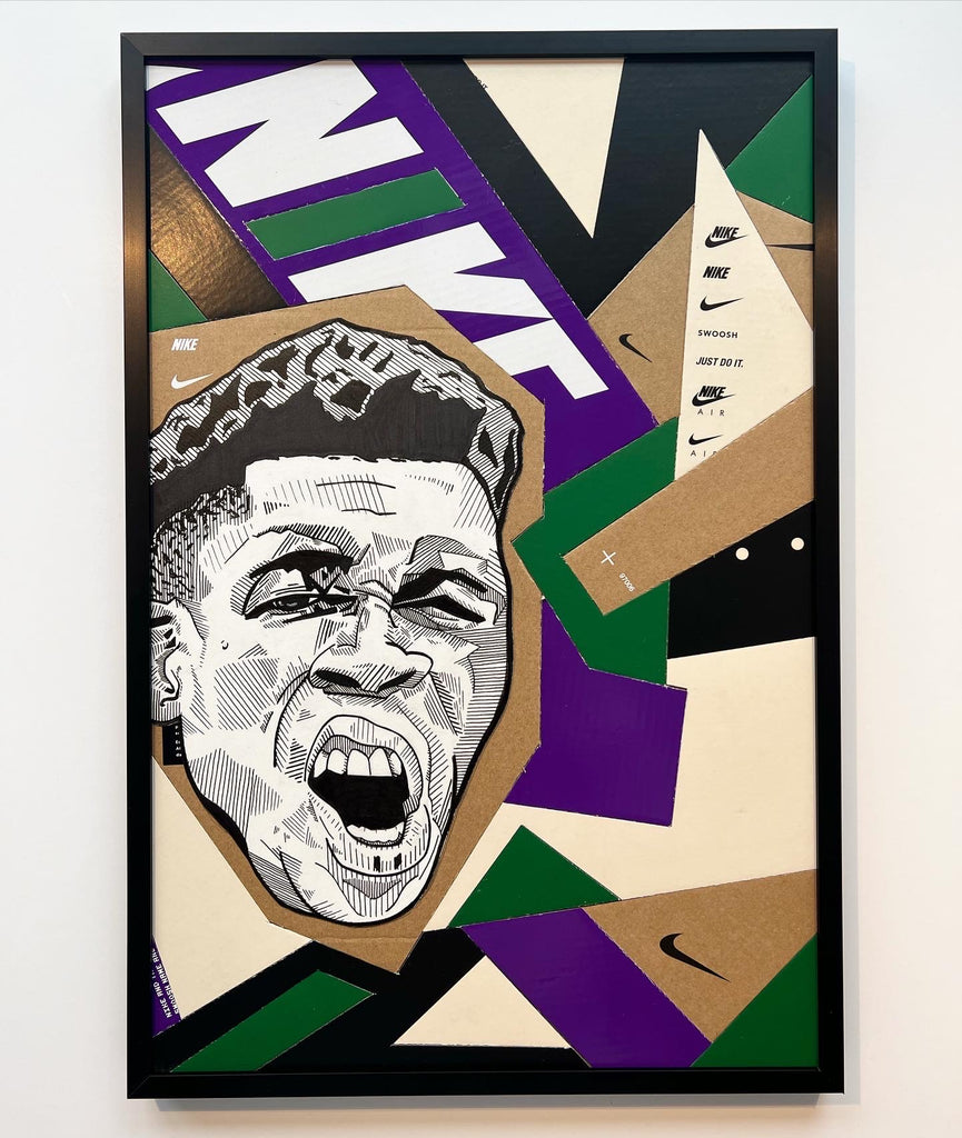 This Original work is a 1/1 with NO prints being made. Hand drawn black/ white Giannis in ink, partnered with various up-cycled shoeboxes in color choices intended on paying homage to the throwback Bucks unforms.