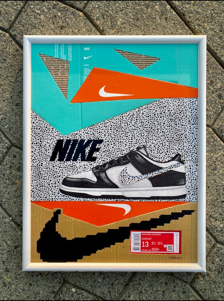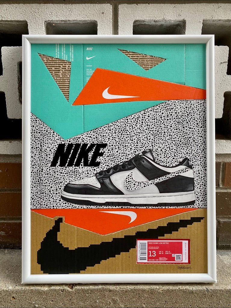 This 14x18" Original "Kixed-Midia" piece is sure to add a pop of color to your space. A hand drawn and cut Nike cut features a negative space swoosh tying in the shoebox background. This piece is jigsaw assembled and fits together perfectly while showcasing a unique composition highlighting some classic Nike Boxes.