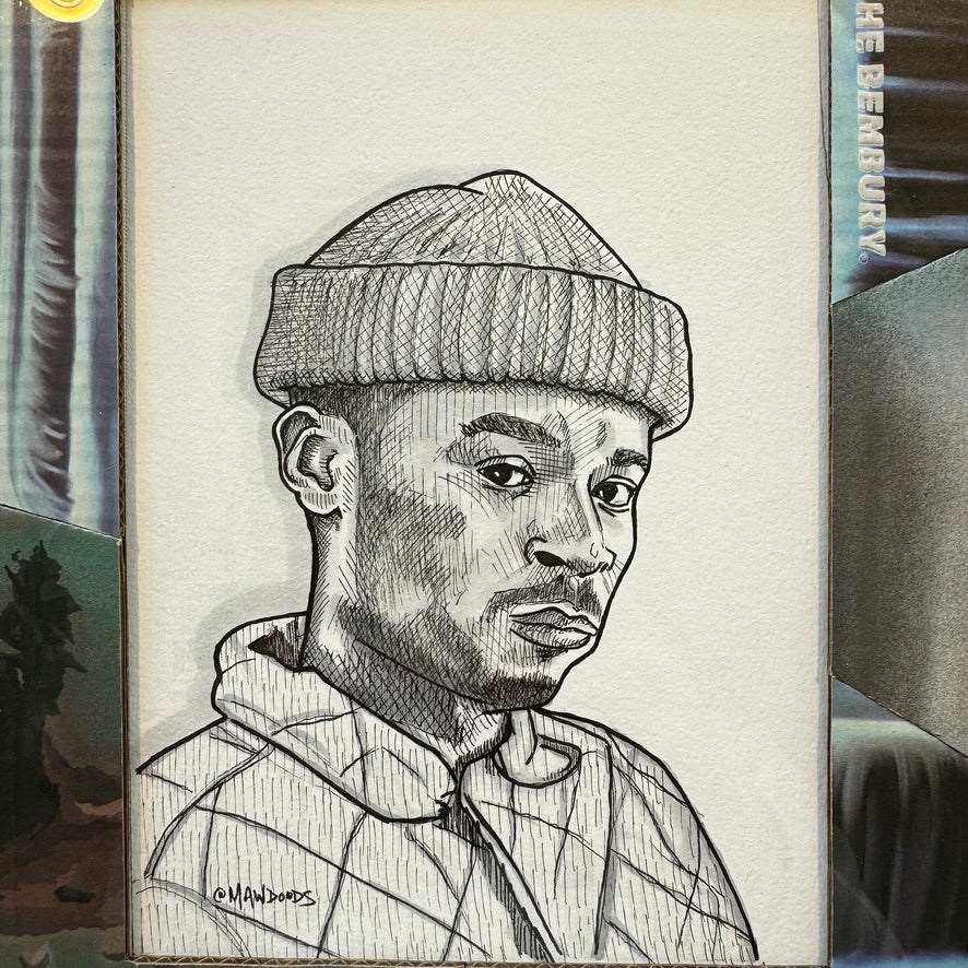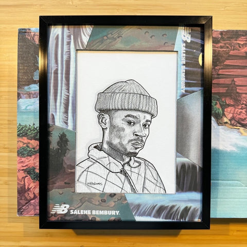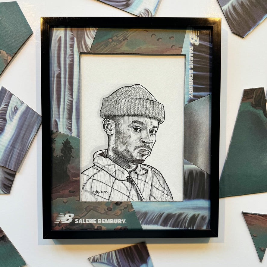 Original portrait of Salehe Bembury done in ink/ alcohol based markers. Piece is coupled with a handmade original matting made from the New Balance x Salehe 2002R shoebox (RARE). 8x10" black metal frame included.