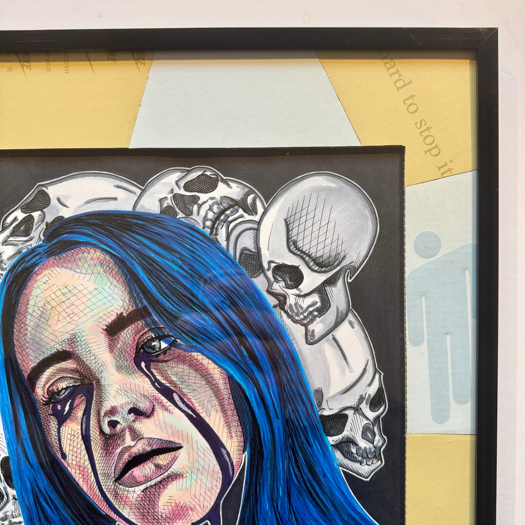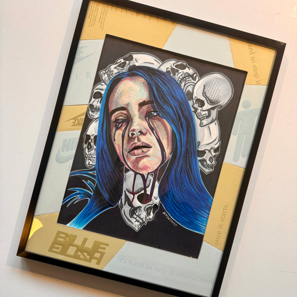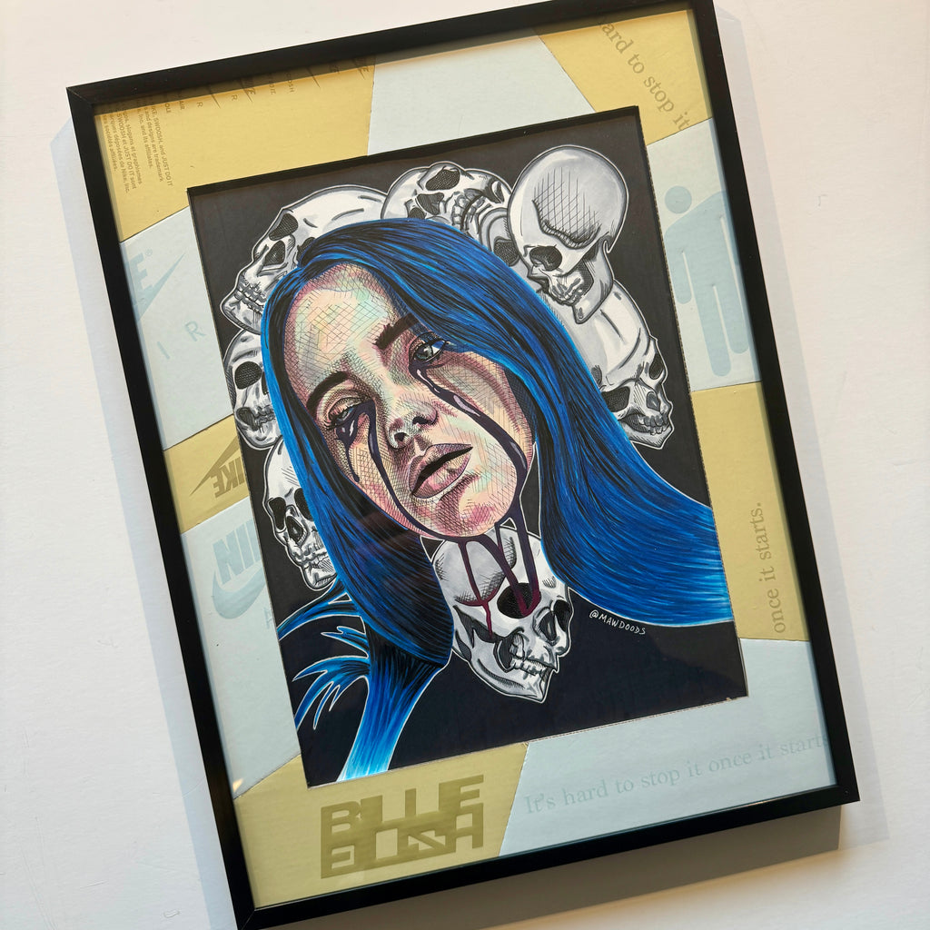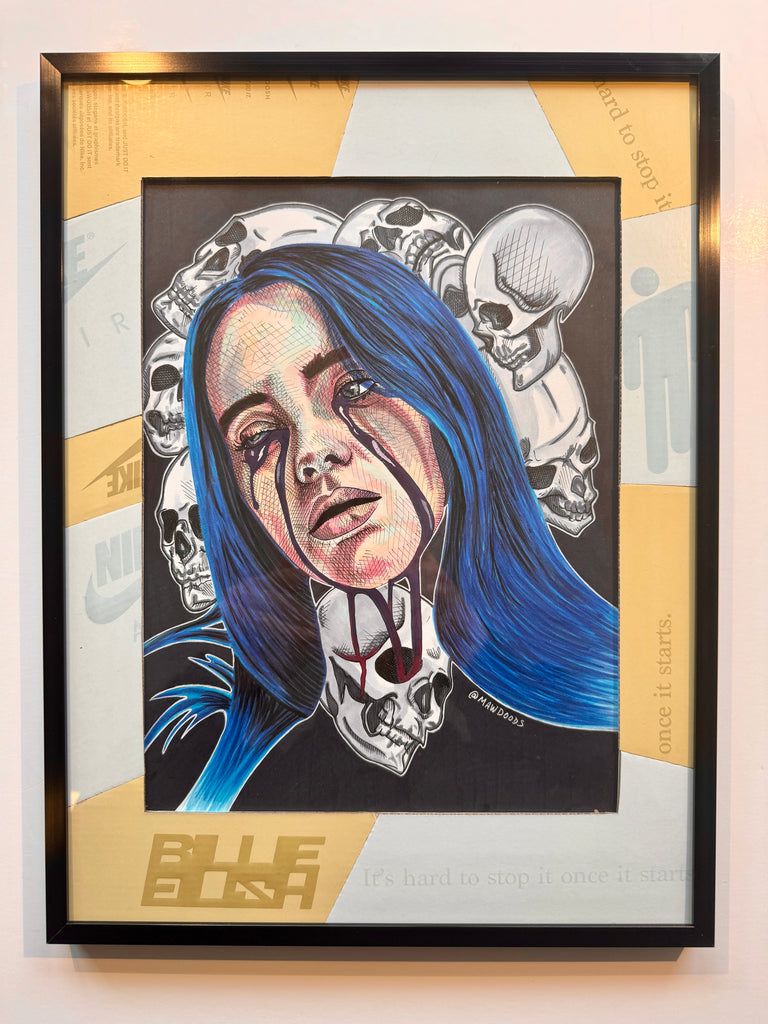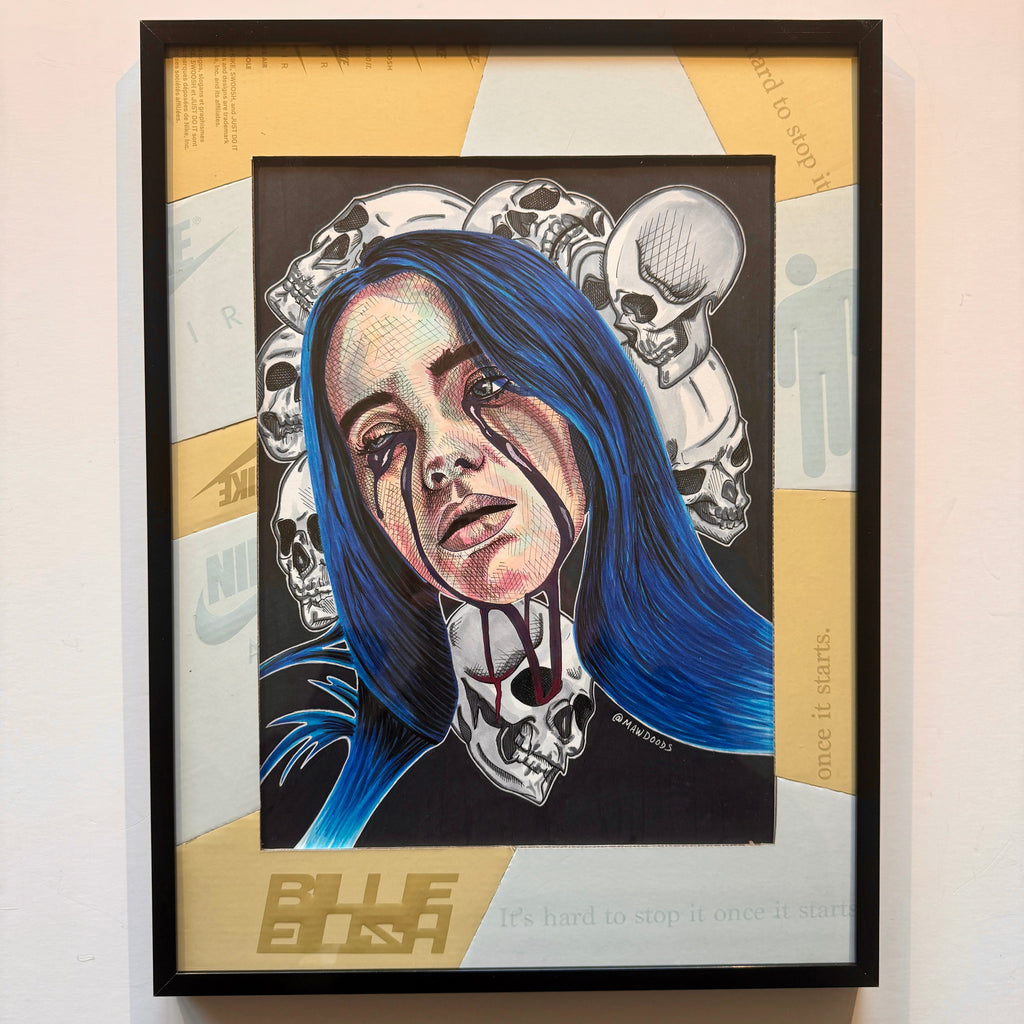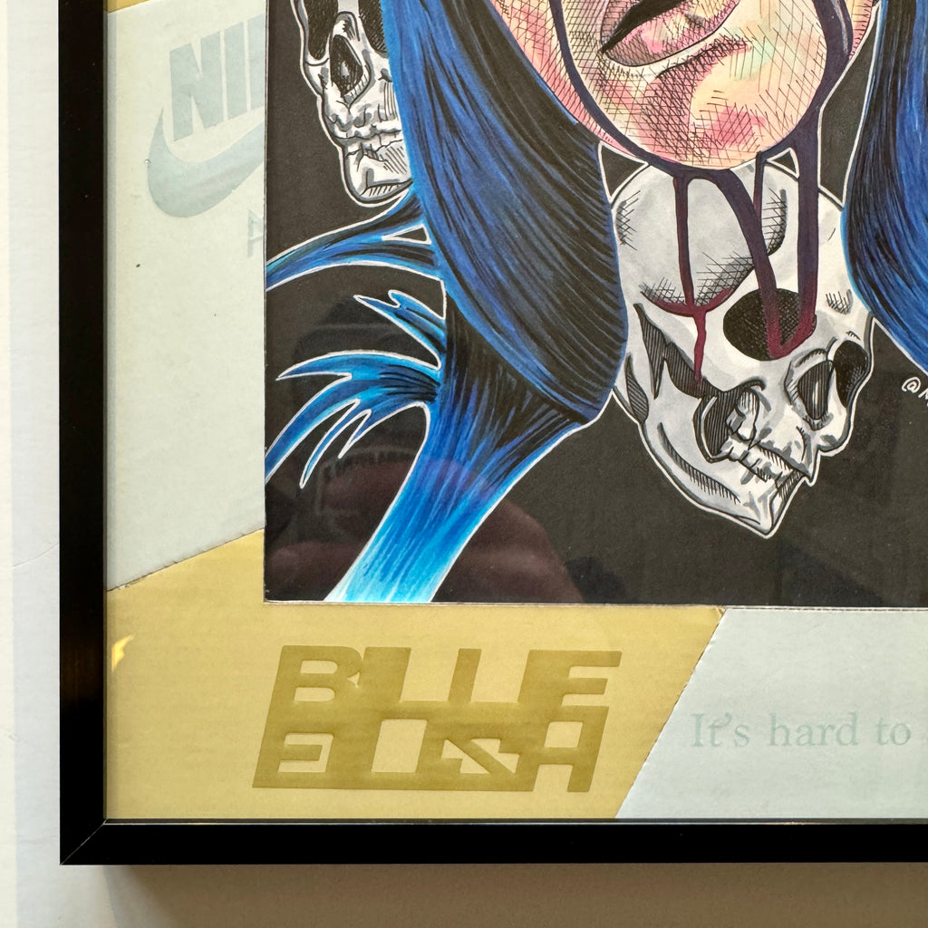 Original work done in alcohol based markers, ink, and up-cycled handmade shoebox matting. A Billie shoebox was used to create custom matting for the work; featuring logos and notable branding from the box in two-tone cream and white making this a true 1/1 piece.