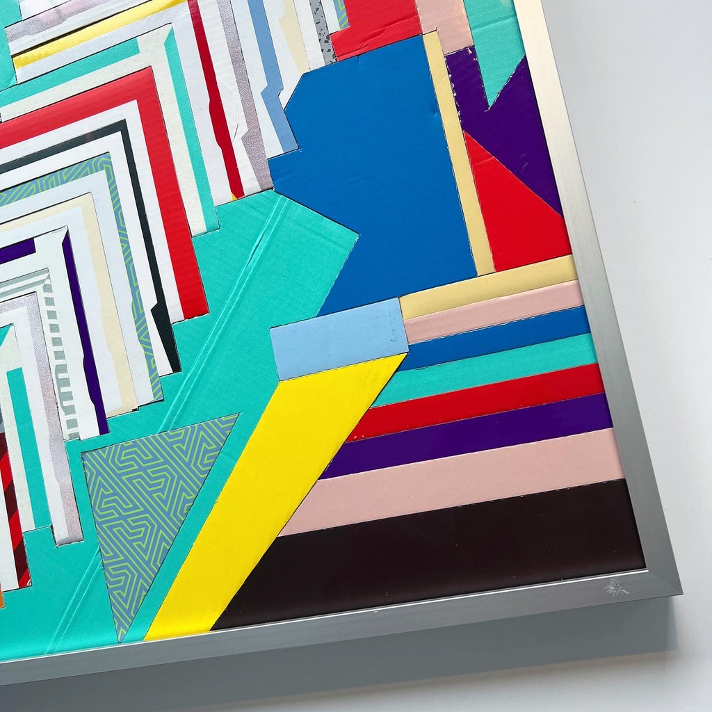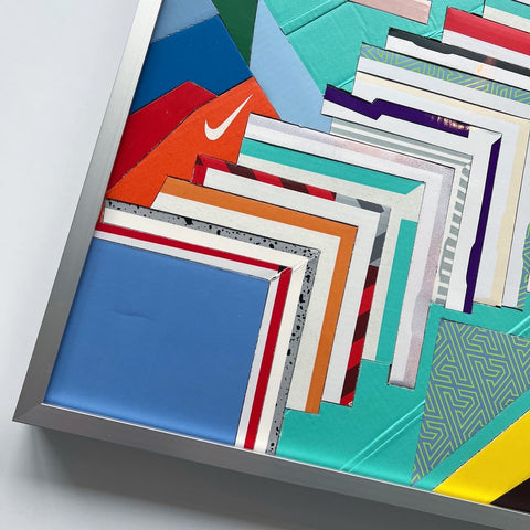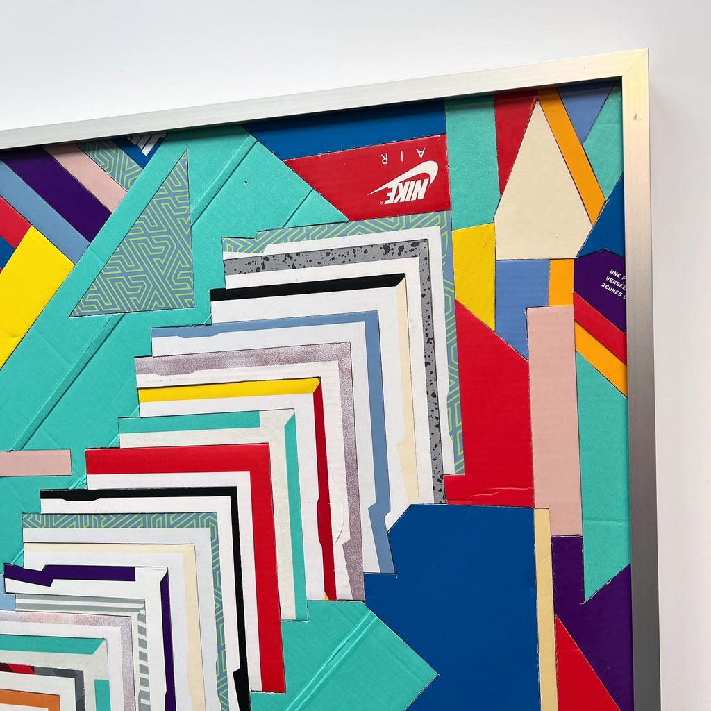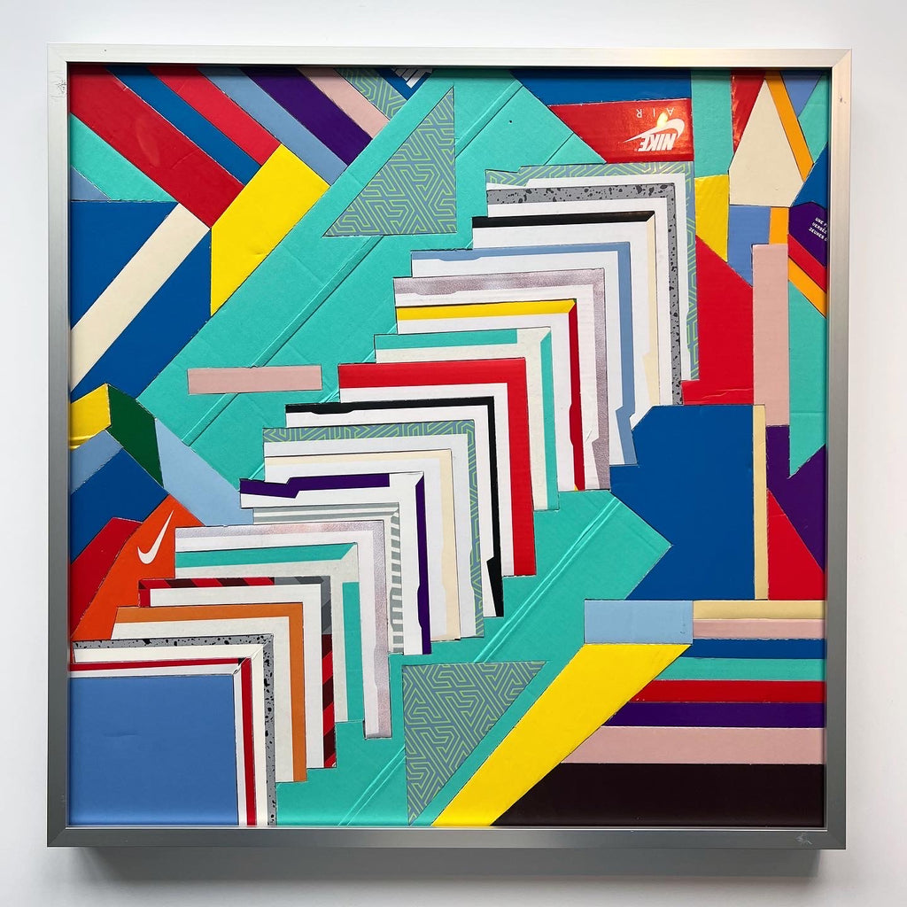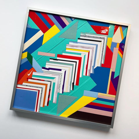 The 4th rendition of the abstract "Spilled Scraps" series using scraps of shoeboxes from previous pieces to create 1/1 original pieces fit for any environment.