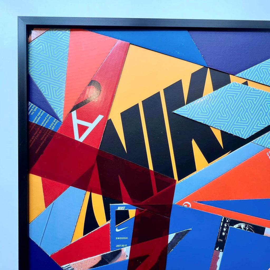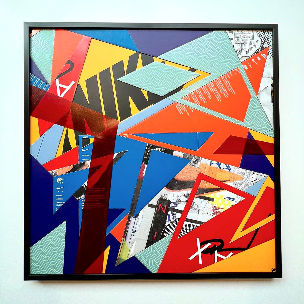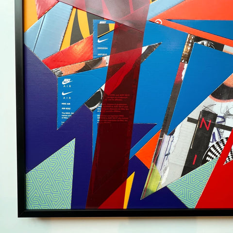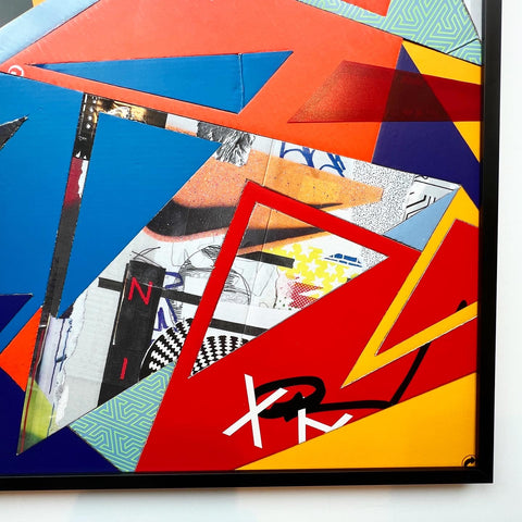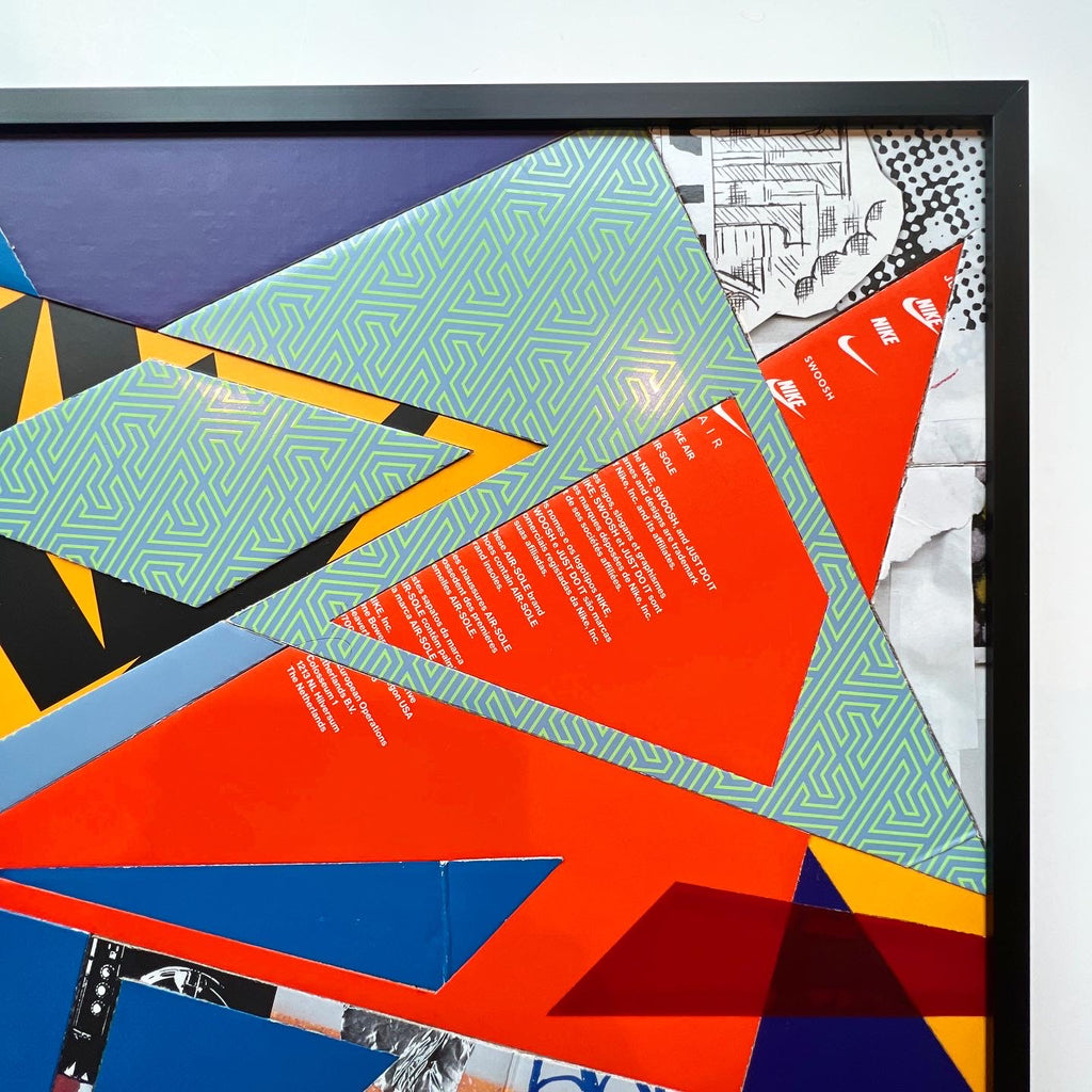 The fifth rendition of the "Spilled Scraps" series. A colorful, trippy composition has this piece bursting with energy, sure to brighten any space. Created using up-cycled "kixed media" (Shoeboxes and the components found within)