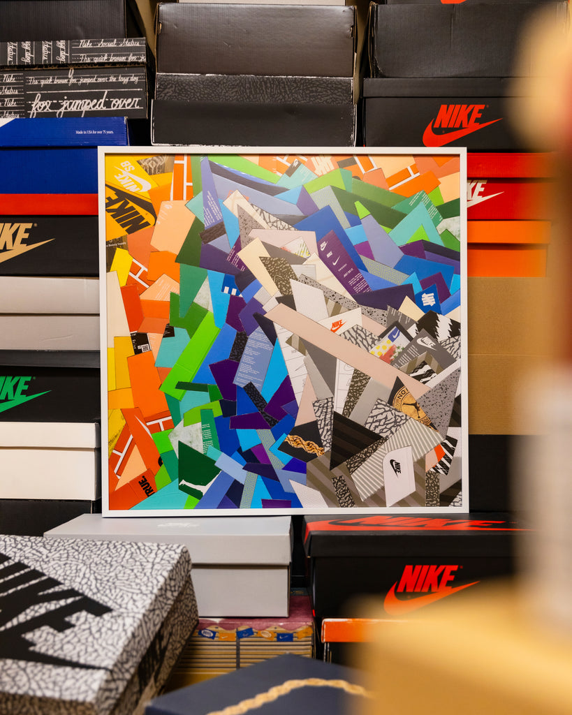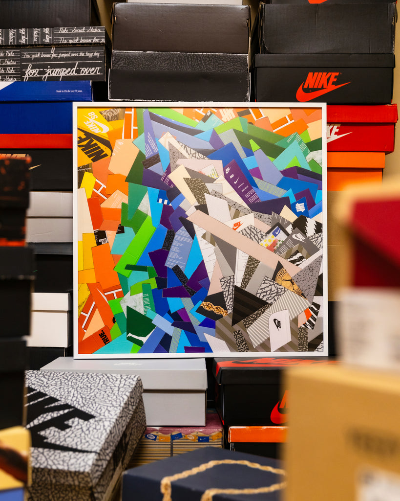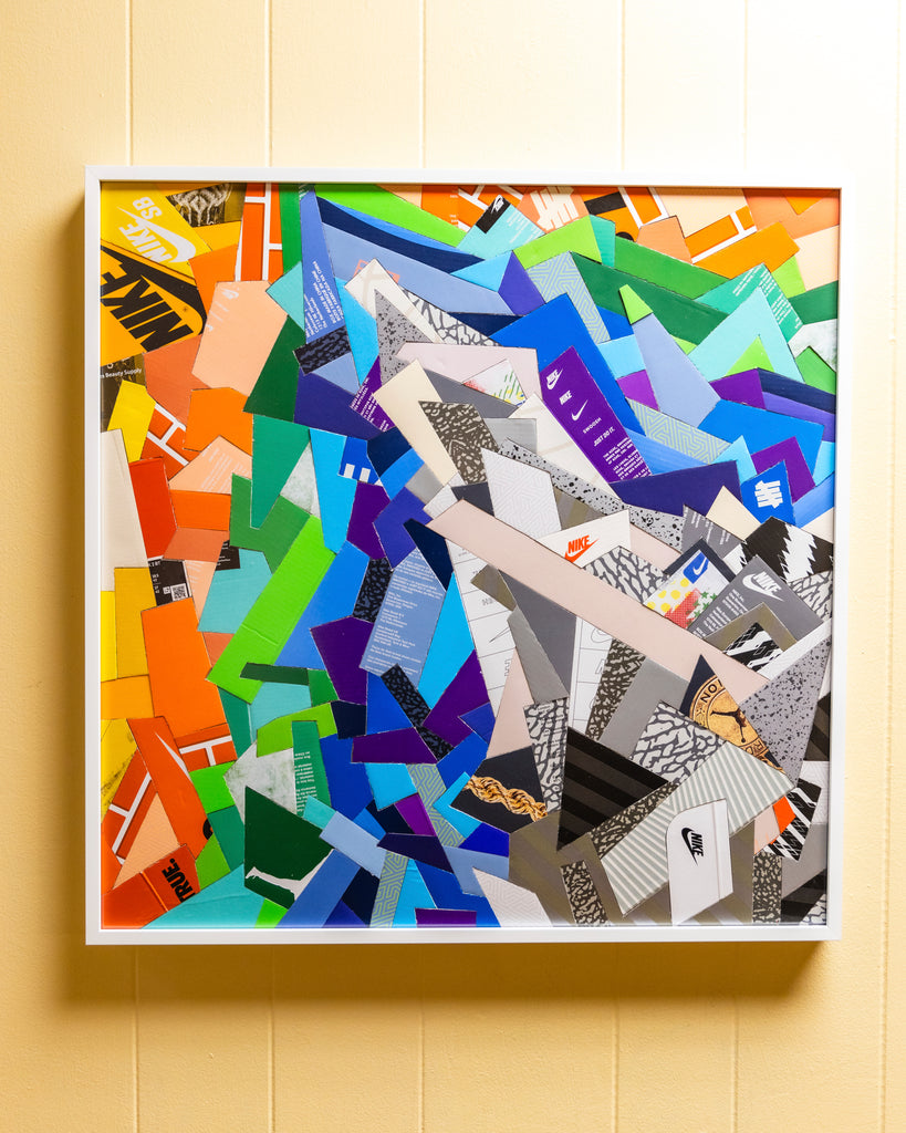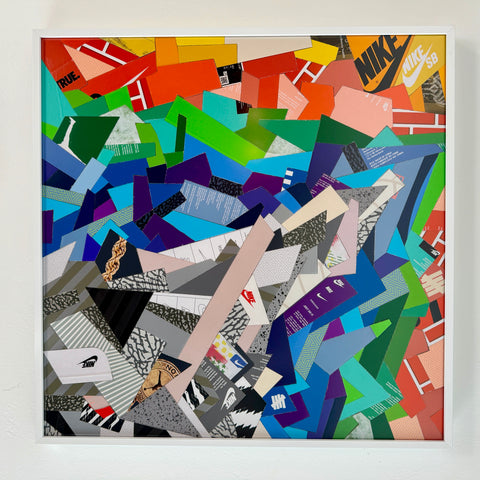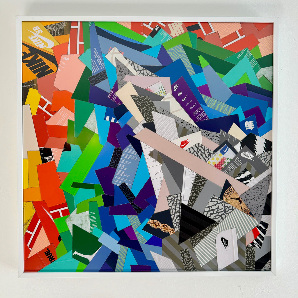 Hand-made and built completely out of upcycled shoeboxes. This original 1/1 work is frame in a custom white heavy duty metal frame equipped with NON glare acrylic to both keep it light and remove unwanted harsh glare.