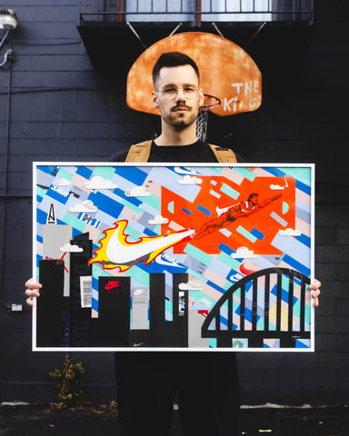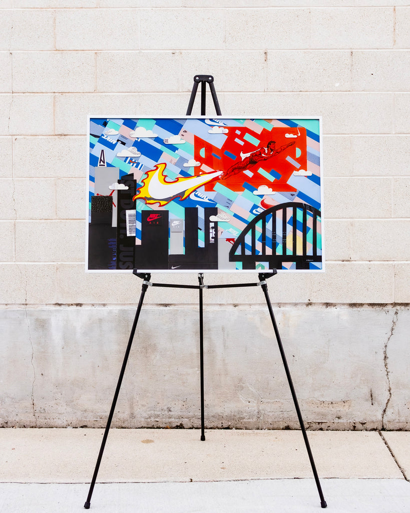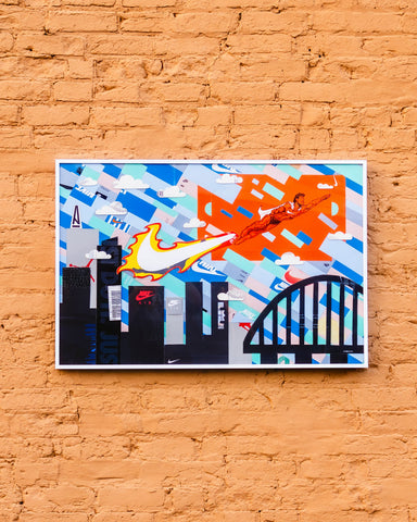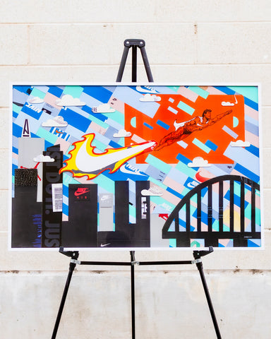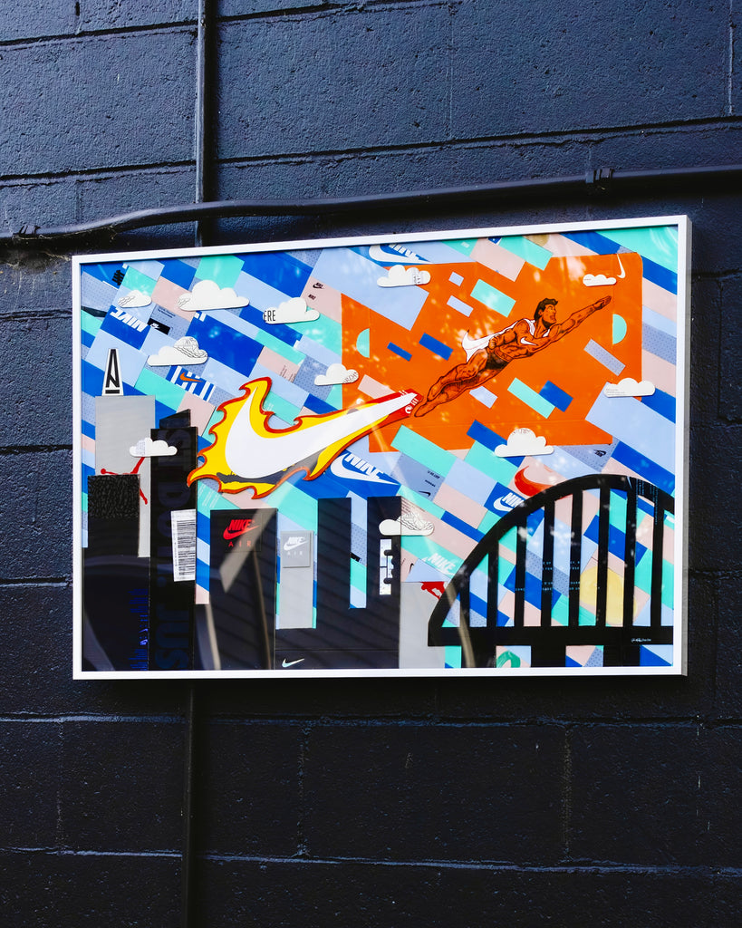 Old branded packaging tape as a skyscraper, bar code and all. A Ma Maniere clouds throughout, hand drawn superman on classic orange box utilizing the logo as part of the cape (look closely). Nike SB, Undefeated x Nike Dunk, AJ4 used in the mosaic sky.