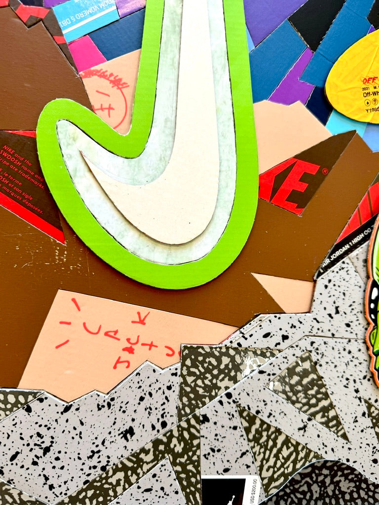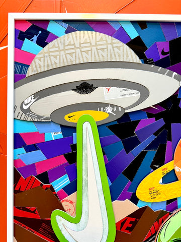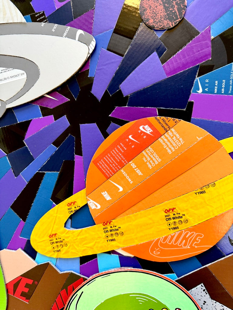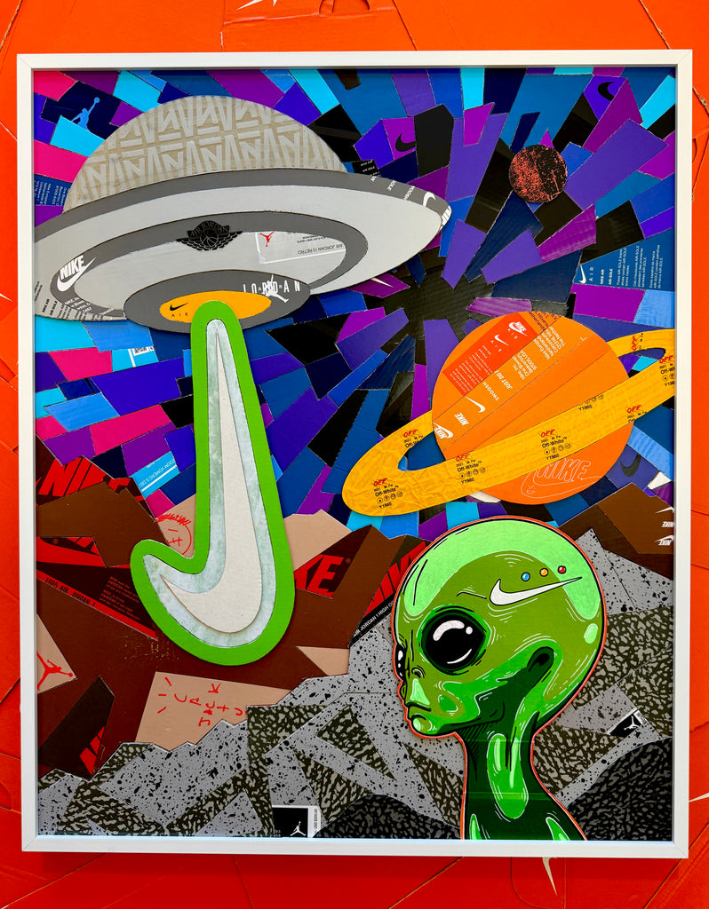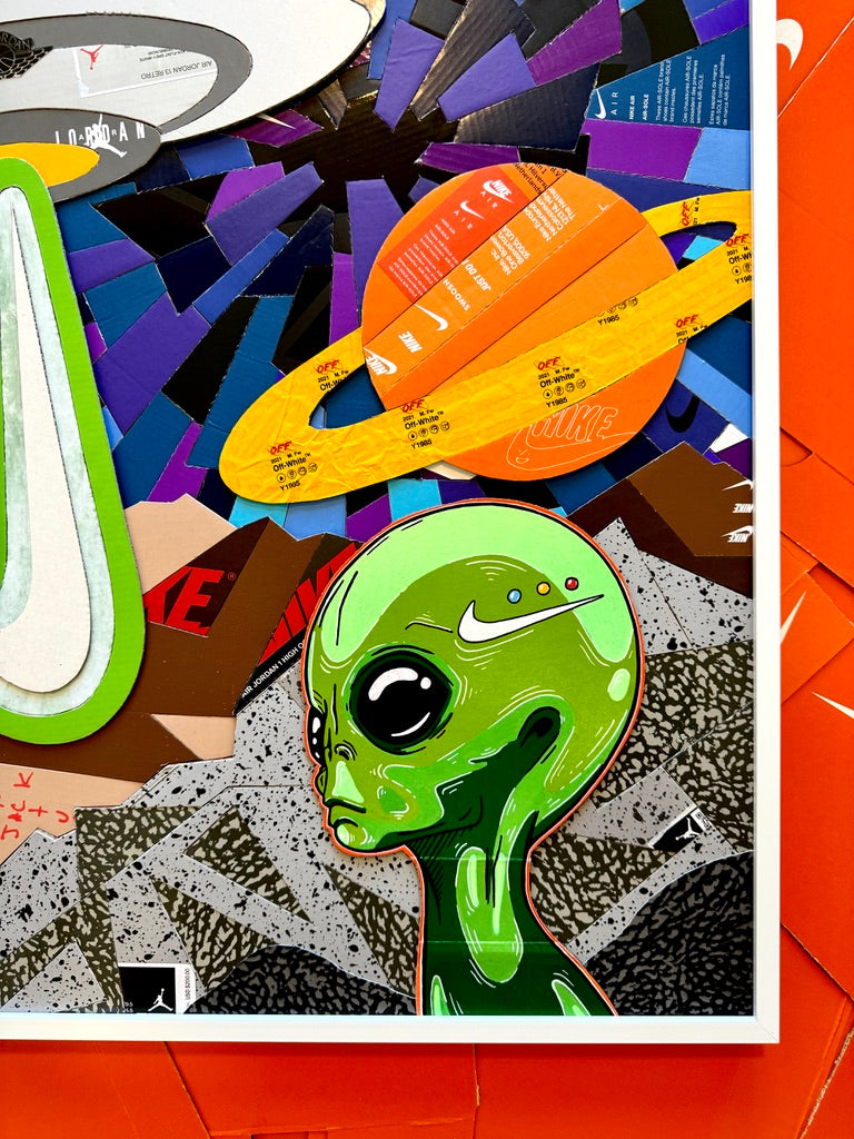 The details are packed into this extraterrestrial themed original work.  The space scenery has it all, completely made out of up-cycled elements from shoeboxes.  Off-White tissue paper planetary rings, Cactus Jack embedded terrain, A Ma Maniere UFO glass and a black hole background all surround an Alien overlooking his world
