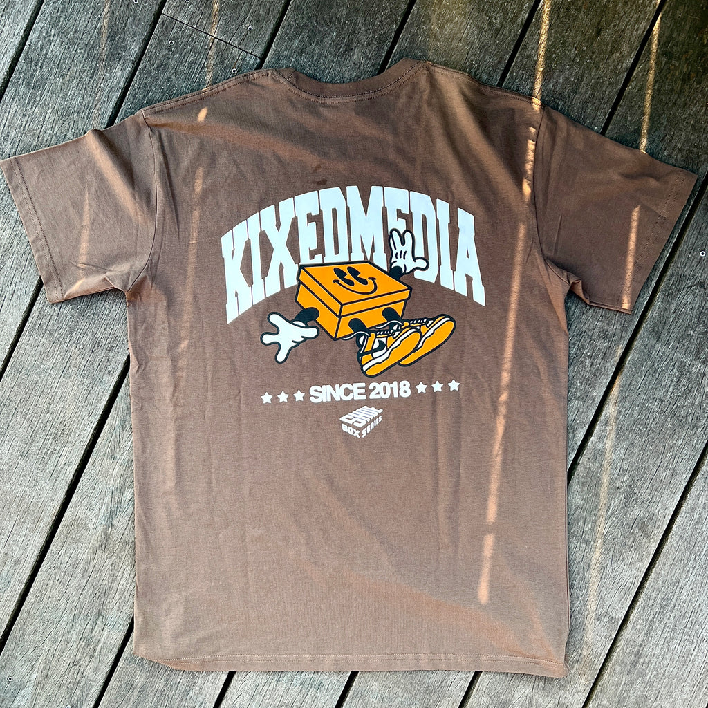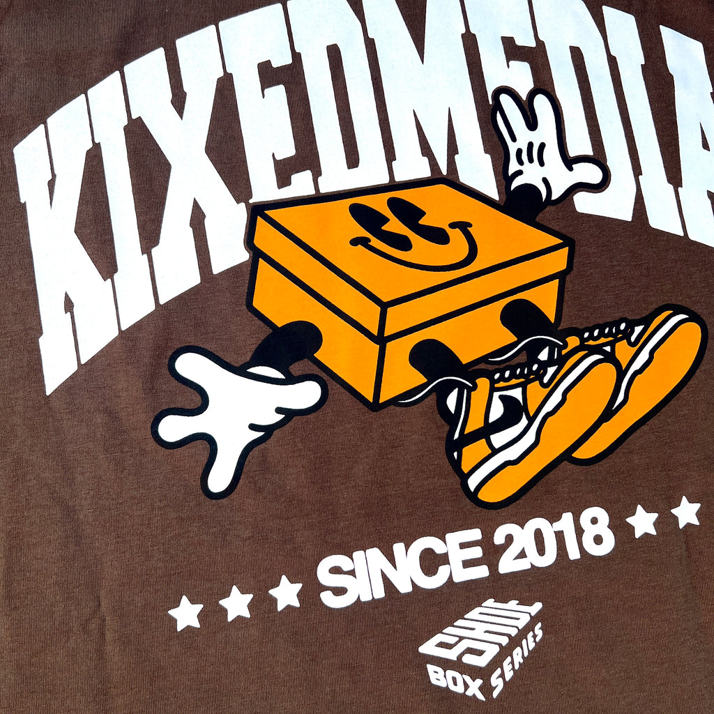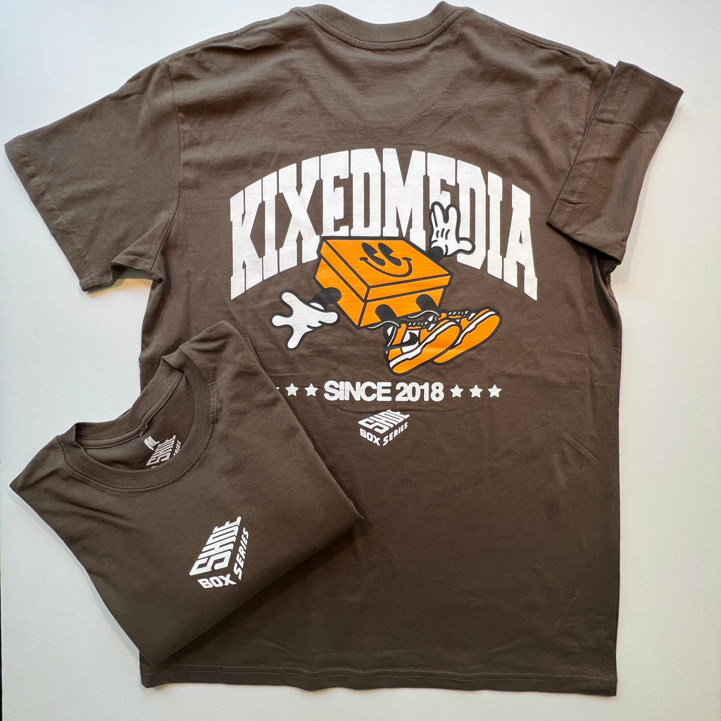 Coming up on 5 years of creating original up-cycled work from Shoeboxes and other like materials. Like the work, only the finest materials went into this Organic Cotton Kixed Media T in a bold "Walnut" colorway
