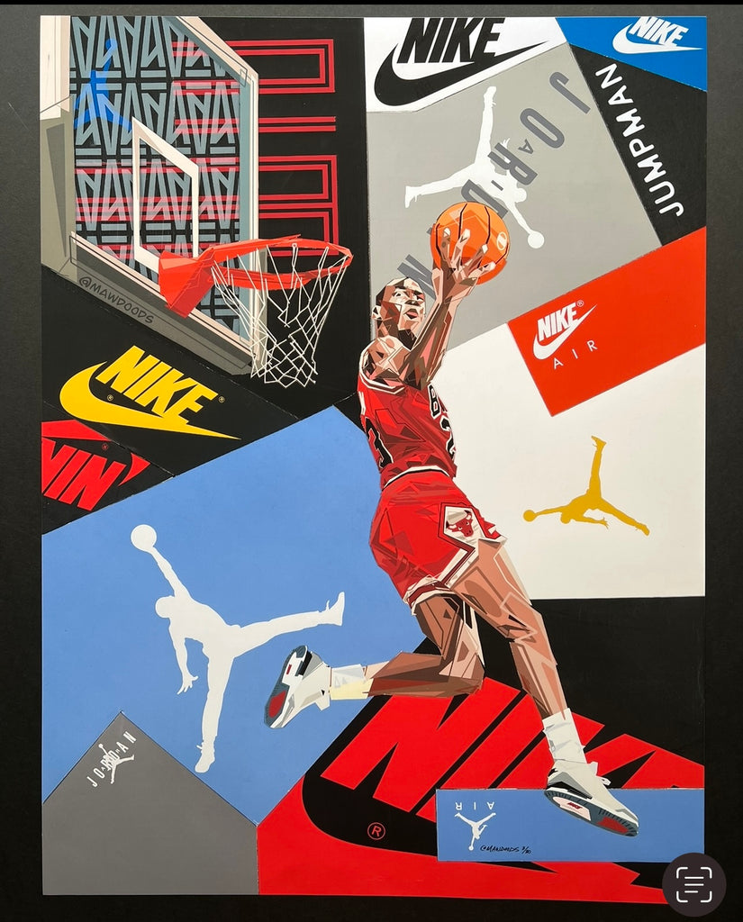 A classic scene from the '88 Dunk contest reimagined using "kixed media"