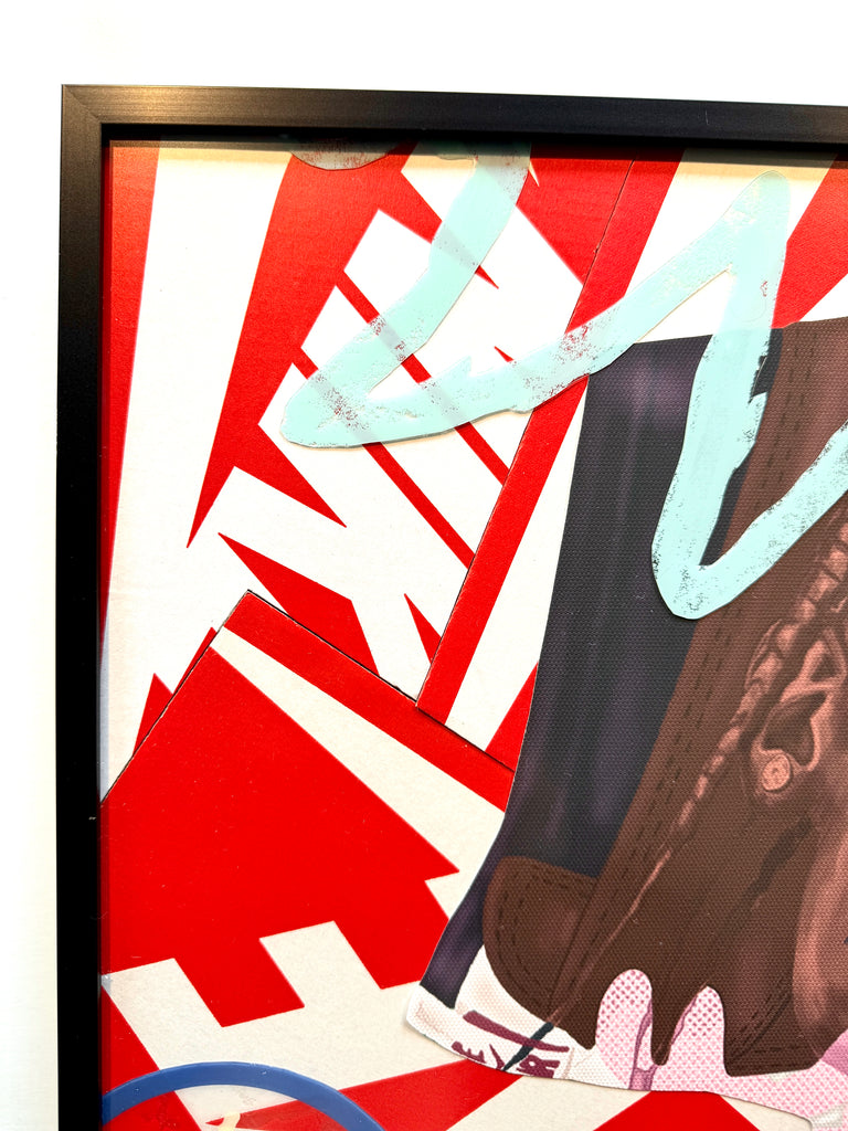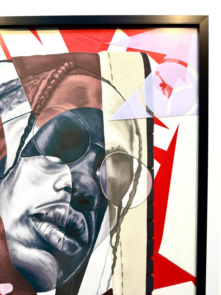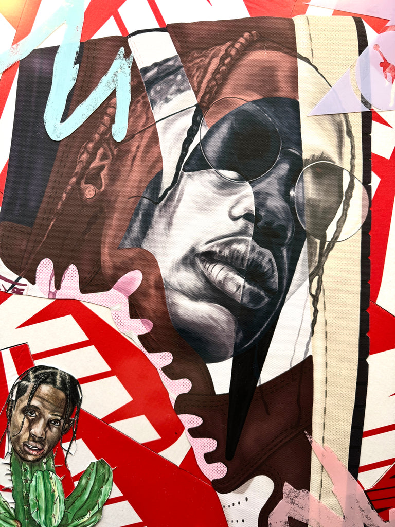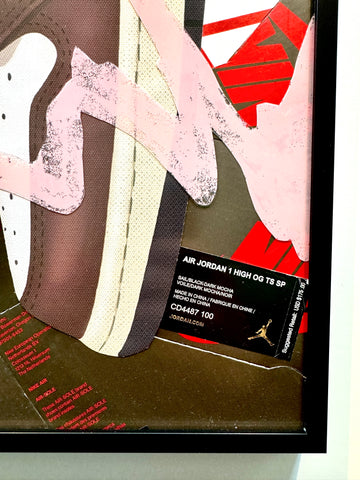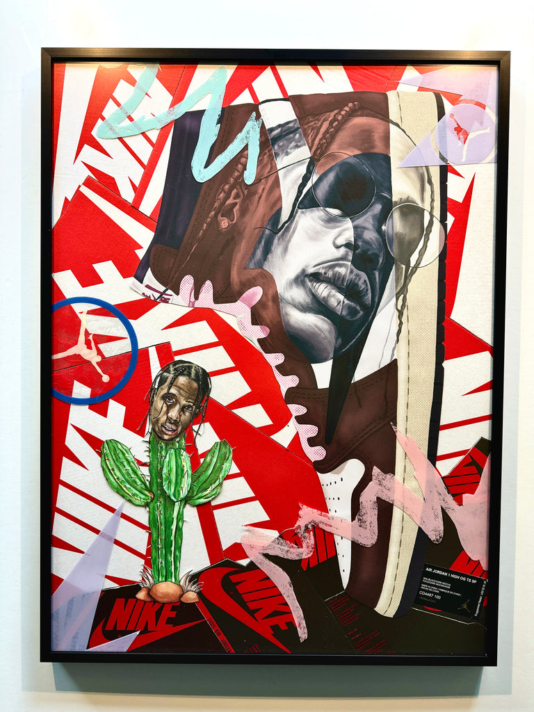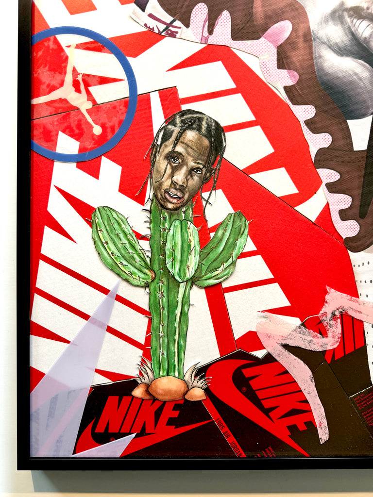 This work features Travis' Jordan 1 High Mocha collab.  A portrait of travis painted over the top of the sneaker combined with the cactus portrait in colored pencil/ marker on paper.  Upcycled shoeboxes completed the background with overlays from the WE THE BEST Jordan 5 plastic shoe casing.