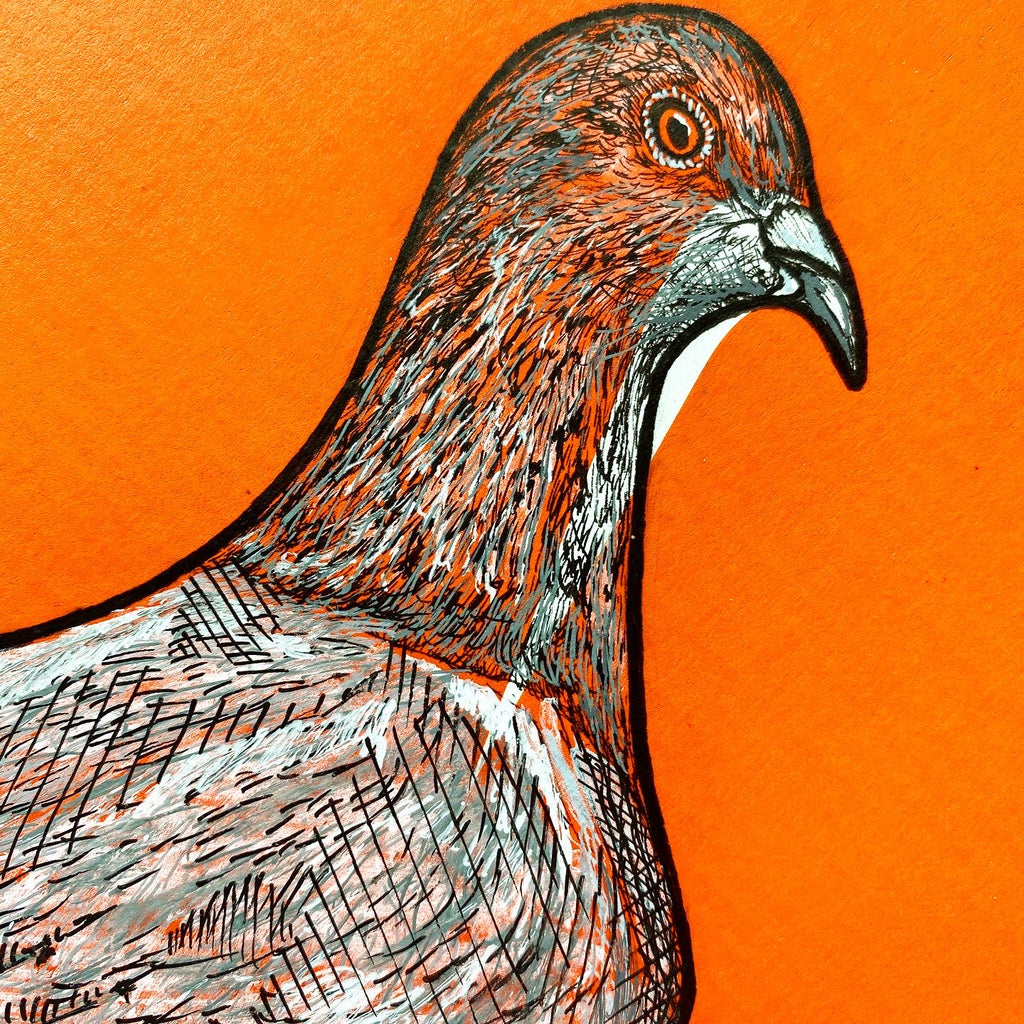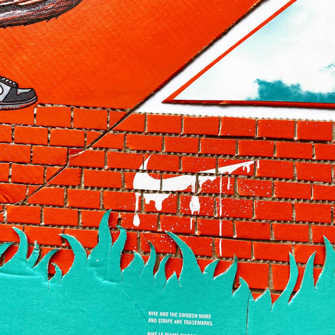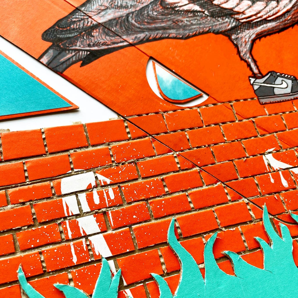 Details: This piece is done in gel pen, ink, construction paper, all sitting on top of hand carved shoeboxes.  Details in the pigeon become more impressive the closer your eye gets to the piece.  Brickwork carved into the shoeboxes, paint drip from the swooshes, and carved grass out of Nike SB boxes bring this piece together.