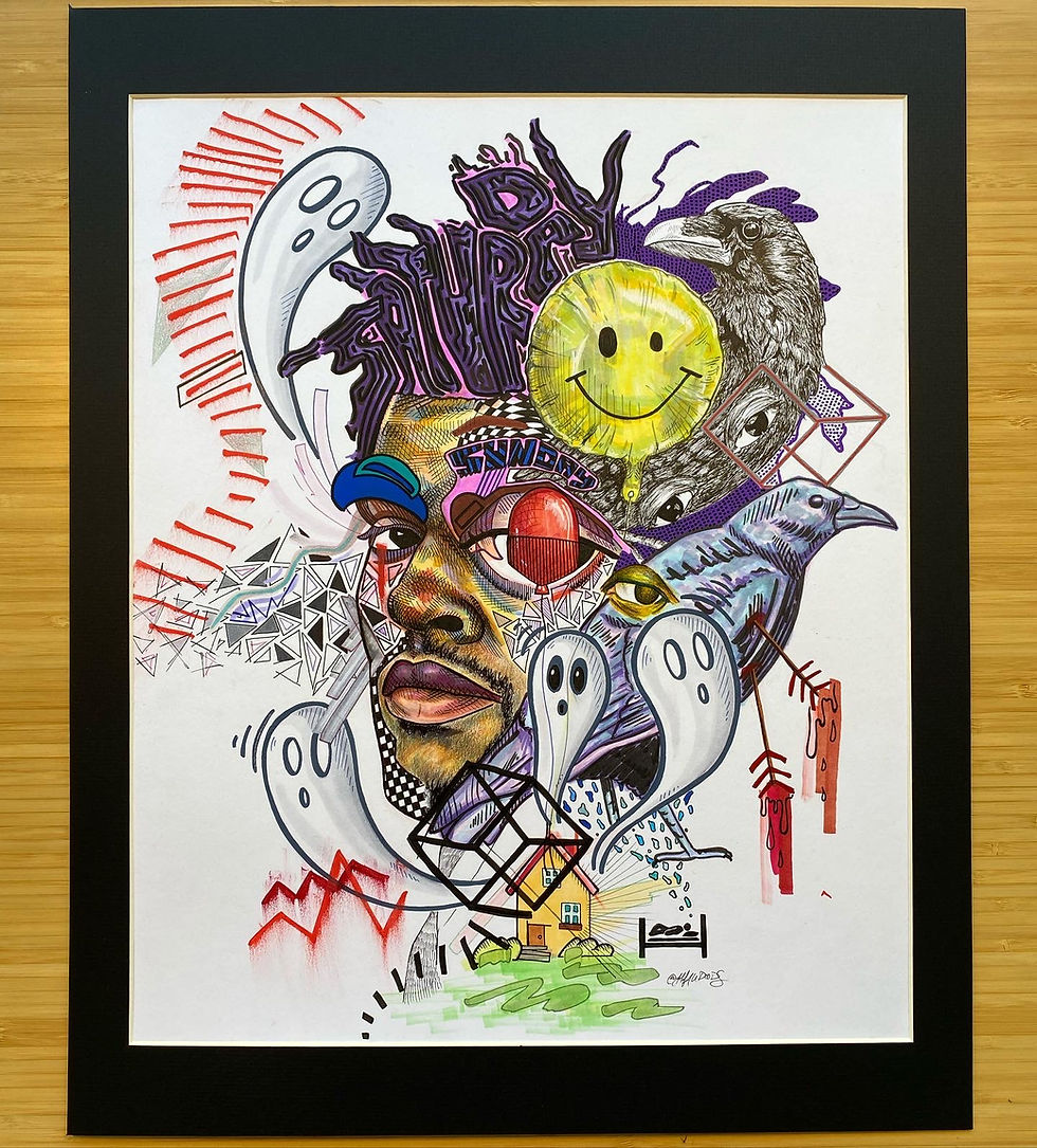 Inspired by an original '85 pair of AJ1s my Dad eventually gifted to me. Worn, worn for hoops, and beat up; they were the reference behind this work done in alchohol based markers, ink, and ballpoint pens.